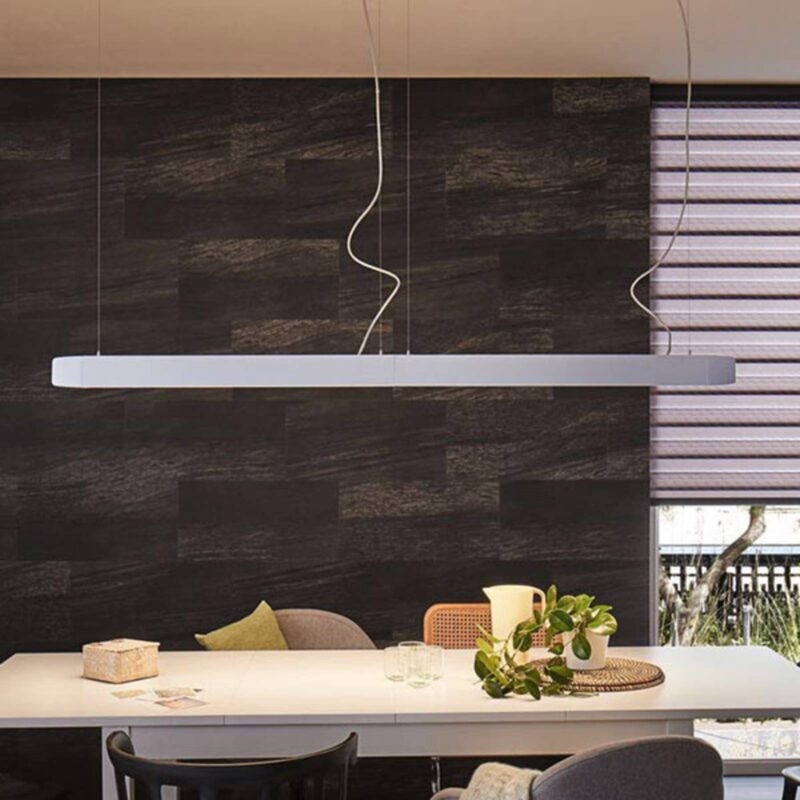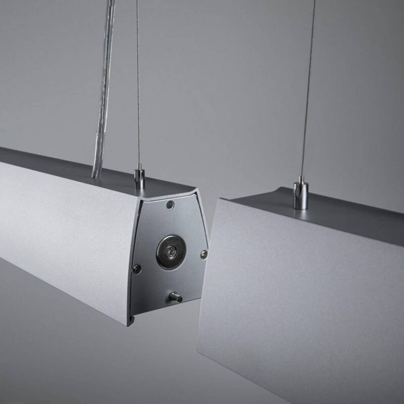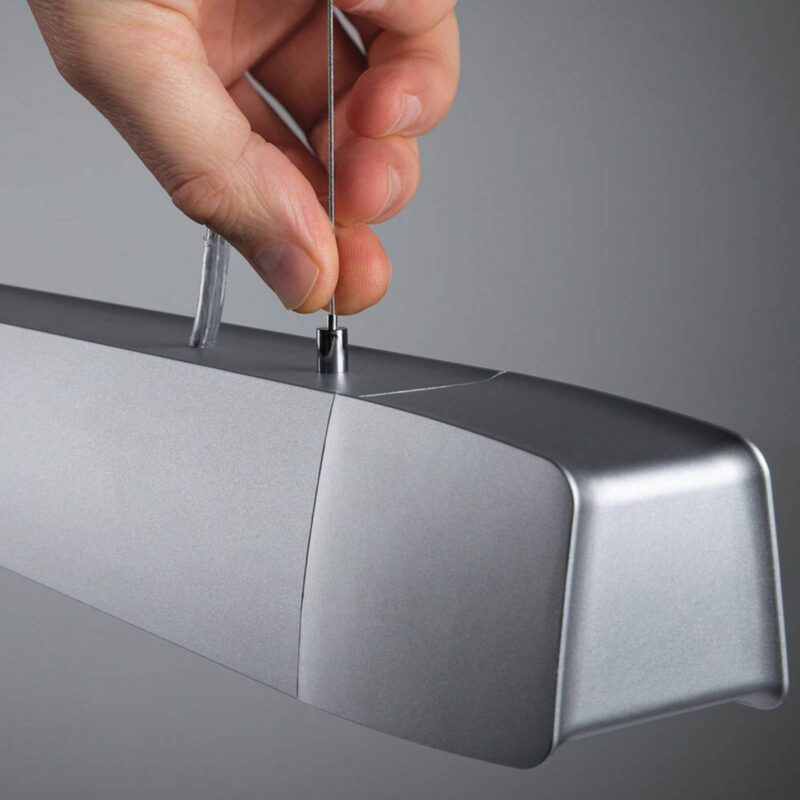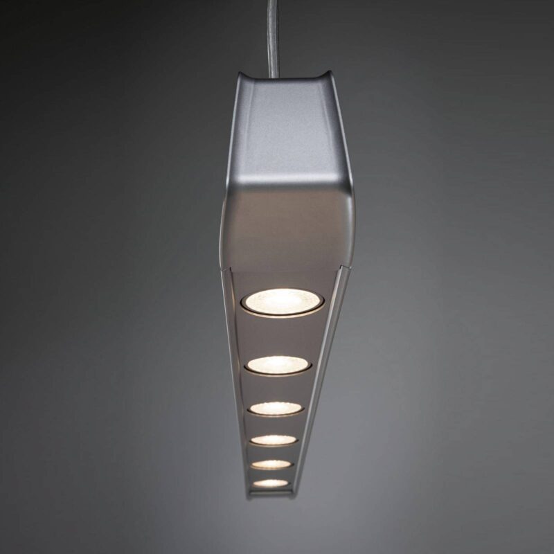 Kyvadlová tyč URail s možnosťou prepojenia Ďalšou možnosťou použitia systému URail rail od spoločnosti Paulmann je toto závesné svietidlo Barre. Vďaka možnosti prepojenia ponúka dokonca prepojenie niekoľkých svetiel Barre, pretože je možné demontovať koncové kryty a zodpovedajúcim spôsobom ich spojiť. Táto výhoda je obzvlášť dôležitá pri dlhých stoloch, ktoré je možné osvetliť ako celok. Pre uvedenie do prevádzky je pre systém koľajníc URail potrebných šesť žiaroviek GU10. Upozornenie: Fotografia zobrazuje dve navzájom prepojené kópie žiarovky.