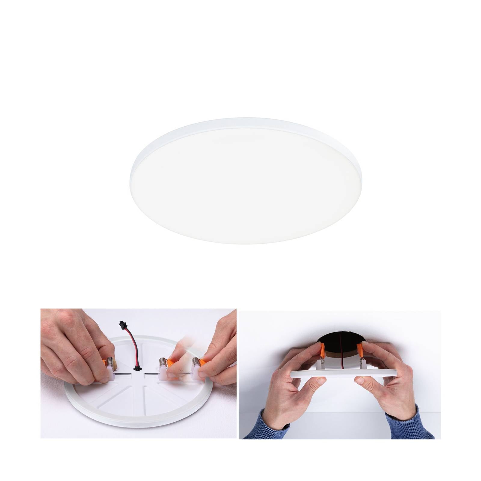 Stmievateľné vstavané svietidlo LED Veluna Edge IP44, okrúhle, farba svetla univerzálna biela Okrúhly vstavaný panel LED Veluna VariFit Edge sa vďaka bezrámovému dizajnu a saténovému krytu takmer bez problémov hodí do každého stropu. Kryt rovnomerne rozptyľuje svetlo teplých bielych LED diód do miestnosti. Vďaka stupňu krytia IP44 ho možno inštalovať aj v kúpeľni alebo iných vlhkých priestoroch a jeho jas možno regulovať aj pomocou externého stmievača (C pre elektrické transformátory). Na inštaláciu do rôznych inštalačných otvorov je panel vybavený nastaviteľnými upínacími pružinami a veľmi plochá konštrukcia umožňuje inštaláciu aj v malých hĺbkach dutín. – stmievateľné pomocou stmievača C pre elektrické transformátory – vhodné do kúpeľní a vlhkých miestností vďaka krytiu IP44 – vysoká svetelná účinnosť so širokým priestorovým osvetlením – flexibilná inštalácia VariFit s nastaviteľnými upínacími pružinami