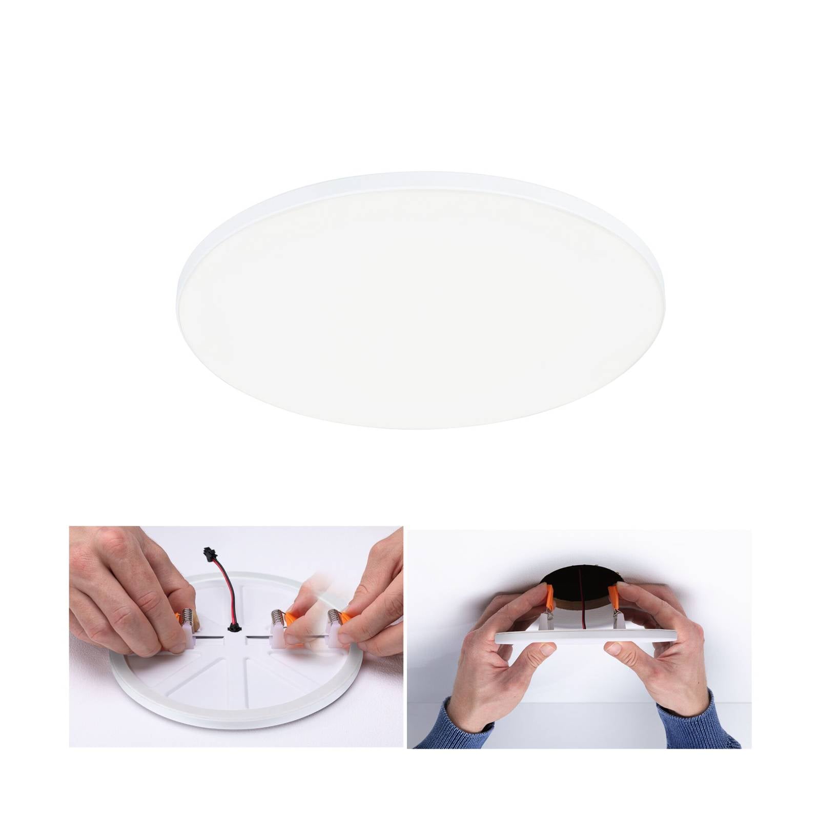 Stmievateľné vstavané svietidlo LED Veluna Edge IP44, okrúhle, farba svetla univerzálna biela Okrúhly vstavaný panel LED Veluna VariFit Edge sa vďaka bezrámovému dizajnu a satinovanému krytu takmer bez problémov hodí do každého stropu. Kryt rovnomerne rozptyľuje svetlo teplých bielych LED diód do miestnosti. Vďaka stupňu krytia IP44 ho možno inštalovať aj v kúpeľni alebo iných vlhkých priestoroch a jeho jas možno regulovať aj pomocou externého stmievača (C pre elektrické transformátory). Na inštaláciu do rôznych inštalačných otvorov je panel vybavený nastaviteľnými upínacími pružinami a veľmi plochá konštrukcia umožňuje inštaláciu aj v malých hĺbkach dutín. – stmievateľné pomocou stmievača C pre elektrické transformátory – vhodné do kúpeľní a vlhkých miestností vďaka krytiu IP44 – vysoká svetelná účinnosť so širokým priestorovým osvetlením – flexibilná inštalácia VariFit s nastaviteľnými upínacími pružinami