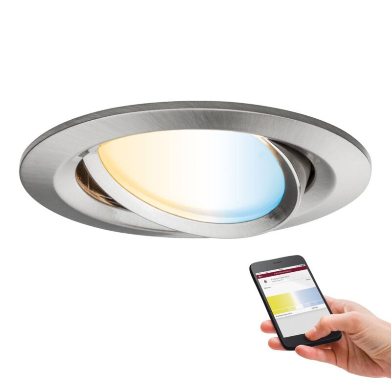 Inteligentne ovládateľný LED zapustený bod Nova Plus s laditeľnou bielou Moderné vstavané bodové svietidlo Nova Plus má okrúhly dizajn z hliníka s matným povrchom a moderné, energeticky úsporné LED diódy, ktoré možno ovládať pomocou technológie ZigBee. To umožňuje ovládanie reflektora pomocou príslušného systému inteligentnej domácnosti, ako je napríklad Philips Hue. Okrem zapínania a vypínania, ktoré je stále možné vykonať pomocou nástenného vypínača, je možné nastaviť aj farbu a intenzitu svetla. Pomocou diaľkového ovládania ZigBee je možné plynulé stmievanie alebo výber medzi teplou bielou a jasnou dennou bielou. Technické údaje / kompatibilita: – možnosť ovládania cez smartfón alebo tablet alebo pomocou diaľkového ovládania Paulmann ZigBee (pozri príslušenstvo) – Laditeľná biela – teplá biela (2 700 K) až denné svetlo (6 500 K) – Možnosť pripojenia do siete – rozsah sa zvyšuje od produktu k produktu – kompatibilný s Amazon Alexa Echo Plus, Philips Hue Bridge 2 (okrem: Hue Entertainment), LEDVANCE SMART+