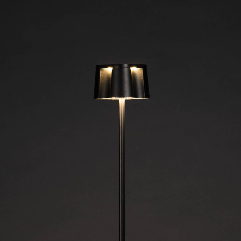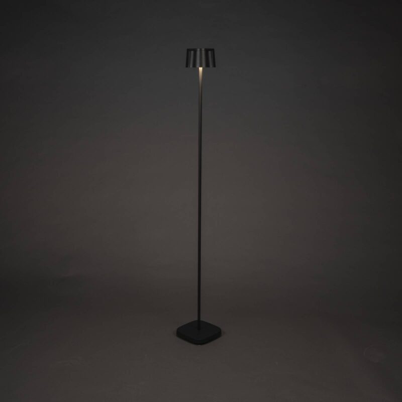 Pekná nabíjateľná stojacia lampa LED, čierna, hliník, IP54, stmievač, CCT