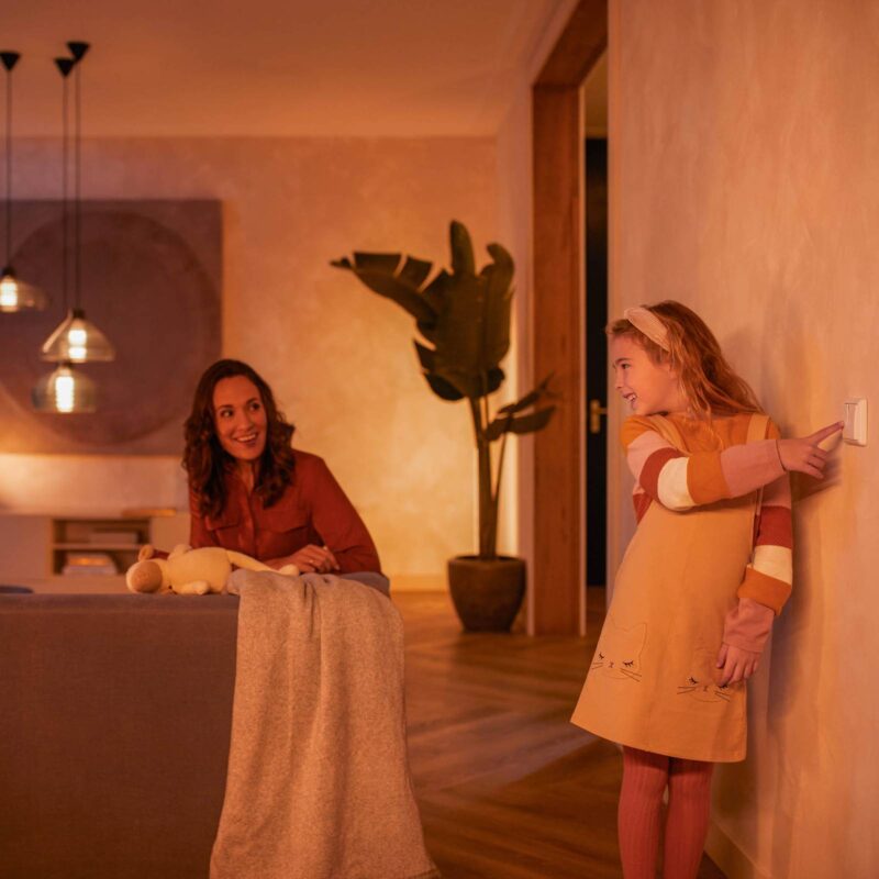 Modul nástenného spínača Philips Hue, balenie 2 ks Modul nástenného vypínača zabezpečuje, že existujúce vypínače svetla možno použiť na ovládanie svietidiel systému inteligentnej domácnosti Philips Hue. Pôvodný spínač svetla je úplne obídený (svorka je súčasťou balenia) a potom je bez napätia. Modul HUE je napájaný batériou a je pripojený k voľným kontaktom vypínača, t. j. inštaluje sa priamo za vypínač alebo tlačidlo svetla a potom sa pripojí k mostíku Philips Hue Bridge. Modul nástenného spínača Philips rozpozná stav skutočného spínača svetla, a tak zapne svietidlo HUE prostredníctvom mostíka. Veľkou výhodou je, že nie je potrebné odlepovať existujúce spínače a k jednému modulu možno pripojiť aj jeden alebo dva spínače. V prípade striedavého obvodu sa jednoducho použije niekoľko modulov. – Dvojité balenie – Hodí sa za existujúce nástenné vypínače – na prevádzku je potrebný mostík Philips Hue Bridge (pozri príslušenstvo) Poznámka: možno použiť len pre svietidlá Hue alebo svetelné zdroje Hue. Bežné svietidlá bez technológie Hue by sa s týmto nástenným modulom rozsvietili natrvalo.