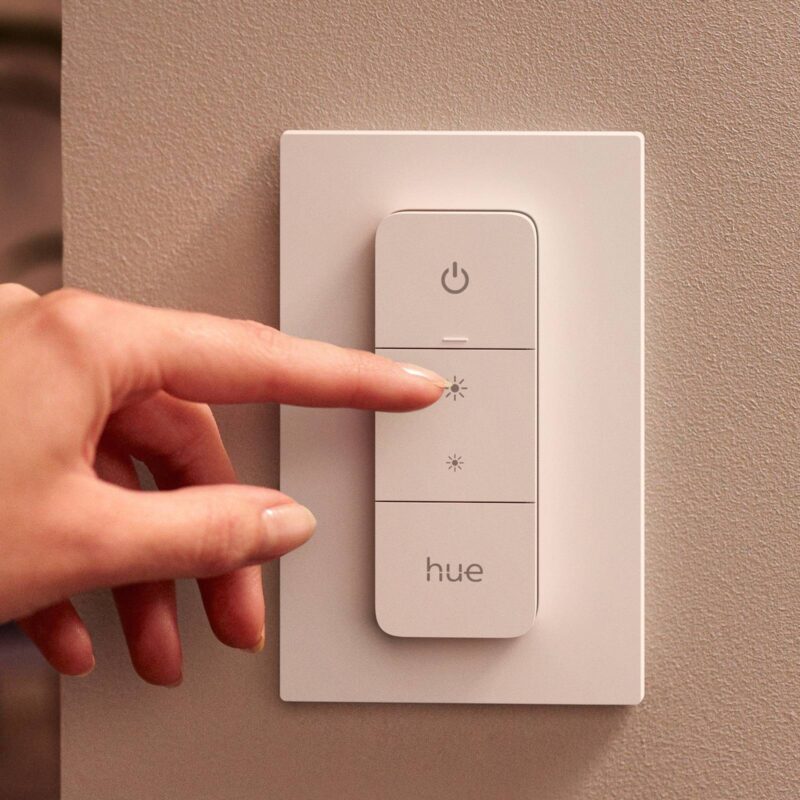 Bezdrôtový stmievač Philips Hue V2 v aktualizovanom dizajne Stmievací spínač pre žiarovky Philips Hue dostane aktualizáciu s verziou V2. Ako obvykle zaujme intuitívnou použiteľnosťou, nekomplikovanou inštaláciou bez akýchkoľvek káblov a flexibilným umiestnením pomocou nástenného držiaka a magneticky priliehavého spínacieho prvku. Horná časť slúži na zapnutie a vypnutie pripojených svetiel alebo žiaroviek. Tieto sa aktivujú v naprogramovanom nastavení tak, aby sa napríklad ráno zaplo univerzálne biele pracovné osvetlenie alebo večerne doplnkové teplé biele svetlo, v závislosti od toho, kedy je zapnutý stmievač. Polia v strednej časti slúžia na stmievanie. Dolná oblasť slúži na prepínanie medzi štyrmi predprogramovanými scénami „Relax“, „Čítanie“, „Koncentrovať“ a „Nabiť batérie“. Po integrácii do systému Hue (je potrebný most) je možné dolnému tlačidlu priradiť aj individuálne nakonfigurované svetelné scény. Technické špecifikácie: – Rozsah dodávky: spínacia časť s gombíkovou bunkou, nástenný držiak so skrutkami a lepiaca páska na pripevnenie – Je možné ovládať až 10 svetiel / svetiel Hue – Doživotnosť: až 50 000 kliknutí – Teplota okolia počas prevádzky: – 10 ° C až + 45 ° C – Dosah: až 12 m – Batéria: 1 x CR2450 (súčasť balenia)