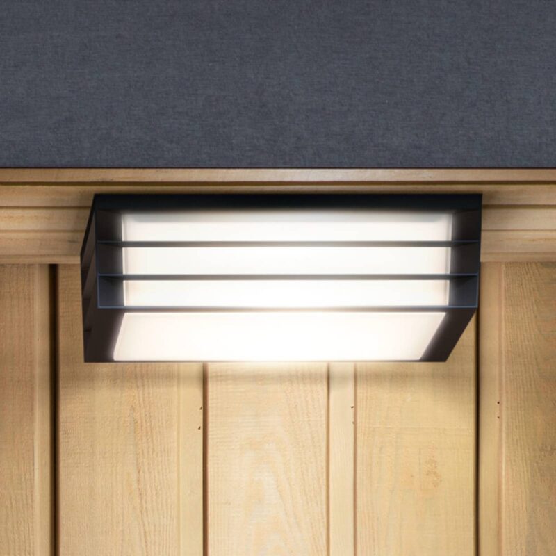 Moonshine myGarden – hranaté vonkajšie stropné svietidlo pre LED žiarovky Dve pätice vo vnútri hranatého vonkajšieho stropného svietidla Moonshine môžu byť osadené aj LED žiarovkami (nie sú súčasťou balenia – objednajte si ich samostatne). Svoj svetelný lúč vyžarujú cez saténový difúzor priamo nadol aj do strán. Robustné vonkajšie stropné svietidlo Moonshine je vyrobené z tlakovo liateho hliníka a vybavené plastovým difúzorom, ktorý zaisťuje rovnomerné a neoslňujúce osvetlenie.