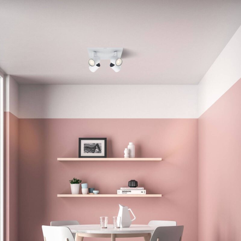 Stropná lampa LED Runner v tvare štvorca so 4 bodovými svetlami Štvorcová stropná lampa LED nalakovaná matnou bielou farbou je zdrojom svetla, ktorý možno použiť na základné osvetlenie mnohých priestorov. Vďaka žiarovkám LED (GU10), ktoré sú súčasťou dodávky, úsporne osvetlí každú miestnosť teplým bielym svetlom. Štyri nastaviteľné bodové svetlá umiestnené v rohoch umožňujú zvýrazniť svetlom rôzne oblasti miestnosti.