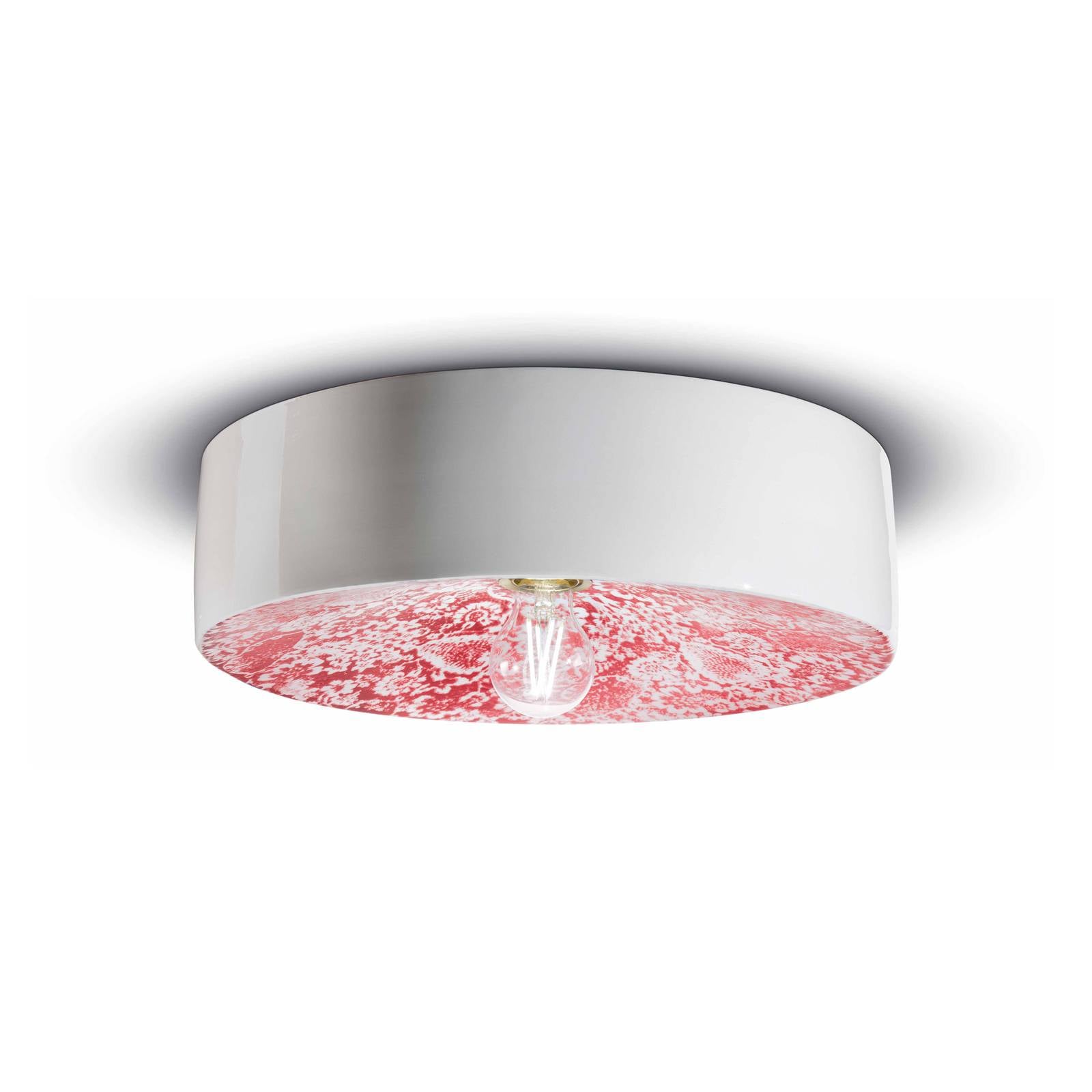 Okrúhle stropné svietidlo PI s dekoratívnym kvetinovým vzorom Stropné svietidlo PI je zdobené krásnym kvetinovým vzorom na hornej a vnútornej strane tienidla. Vonkajšia strana má neutrálnu bielu farbu. Vďaka tomuto nezvyčajnému dizajnu je PI nielen atraktívnym zdrojom svetla, ale slúži aj ako dekoratívny prvok. Stropné svietidlo je vyrobené z keramiky a je mimoriadne efektné nad obývacou izbou alebo jedálenským stolom. PI bolo vyrobené ručne v Taliansku.