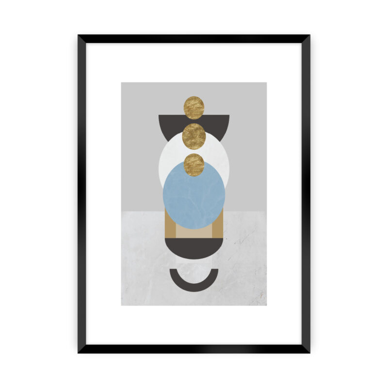 Originálny plagát s geometrickými tvarmi v odtieňoch čiernej, modrej, sivej a zlatej farby na sivom pozadí.