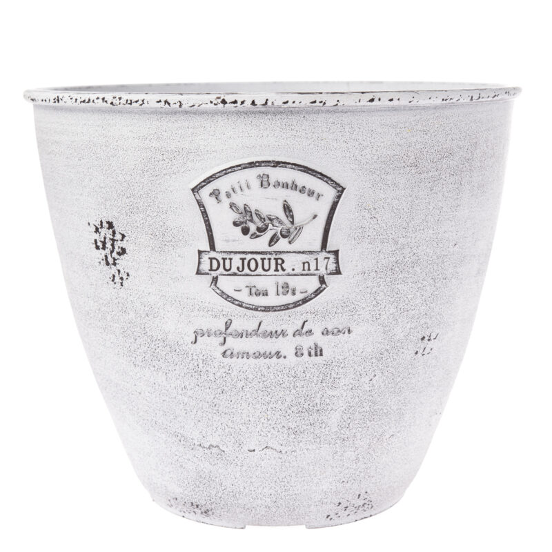 Štýlový plastový obal na kvetináč skvele doladí každú miestnosť, terasu aj balkón. Je vyrobený z recyklovaného ekoplastu s dlhou životnosťou. Má pekný rustikálny vzhľad s bielym povrchom s patinou a plastickým dekoratívnym prvkom v štýle Provence.