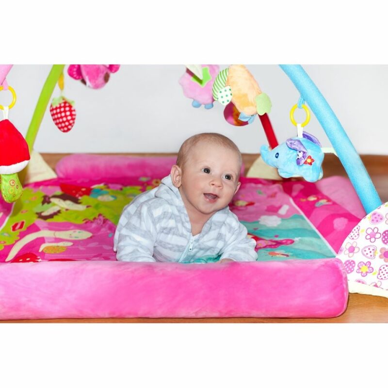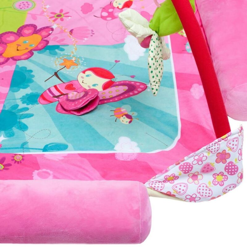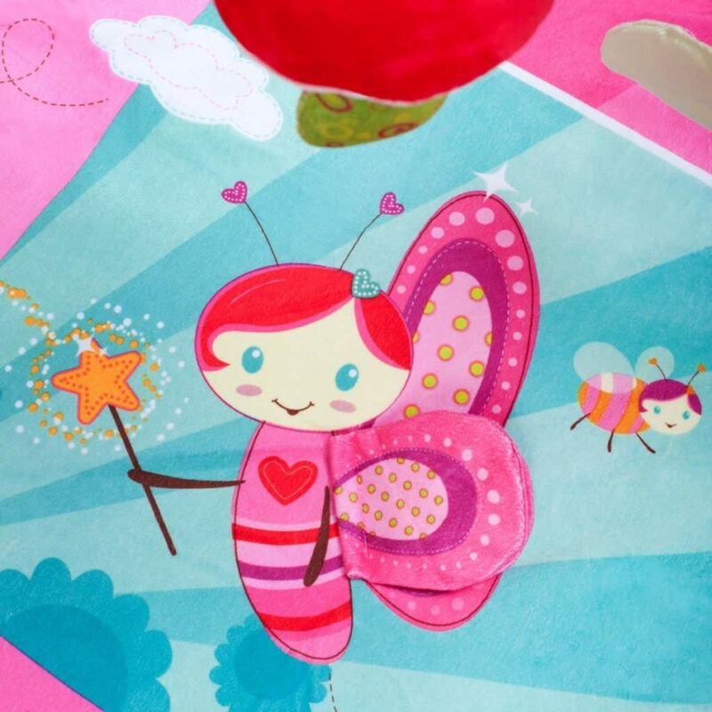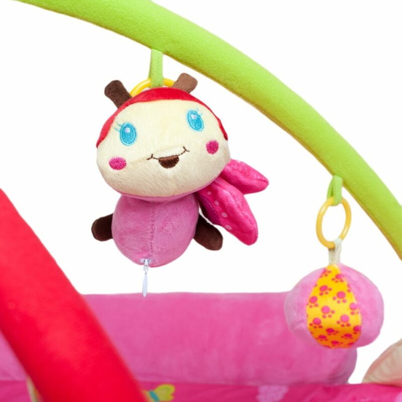 Na deke nájdete papagája s ukrytým hracím modulom, ktorý po stlačení vydáva vtáčie zvuky a tiež motýlika s hracím modulom, ktorý po stlačení hrá melódie. Príjemný a mäkký materiál umožňuje pohodlné ležanie na brušku či chrbte a umožňuje slobodu pohybu dieťaťa. Doplnená hrazdičkou so zavesenými hračkami, ktoré možno odopnúť a používať samostatne.