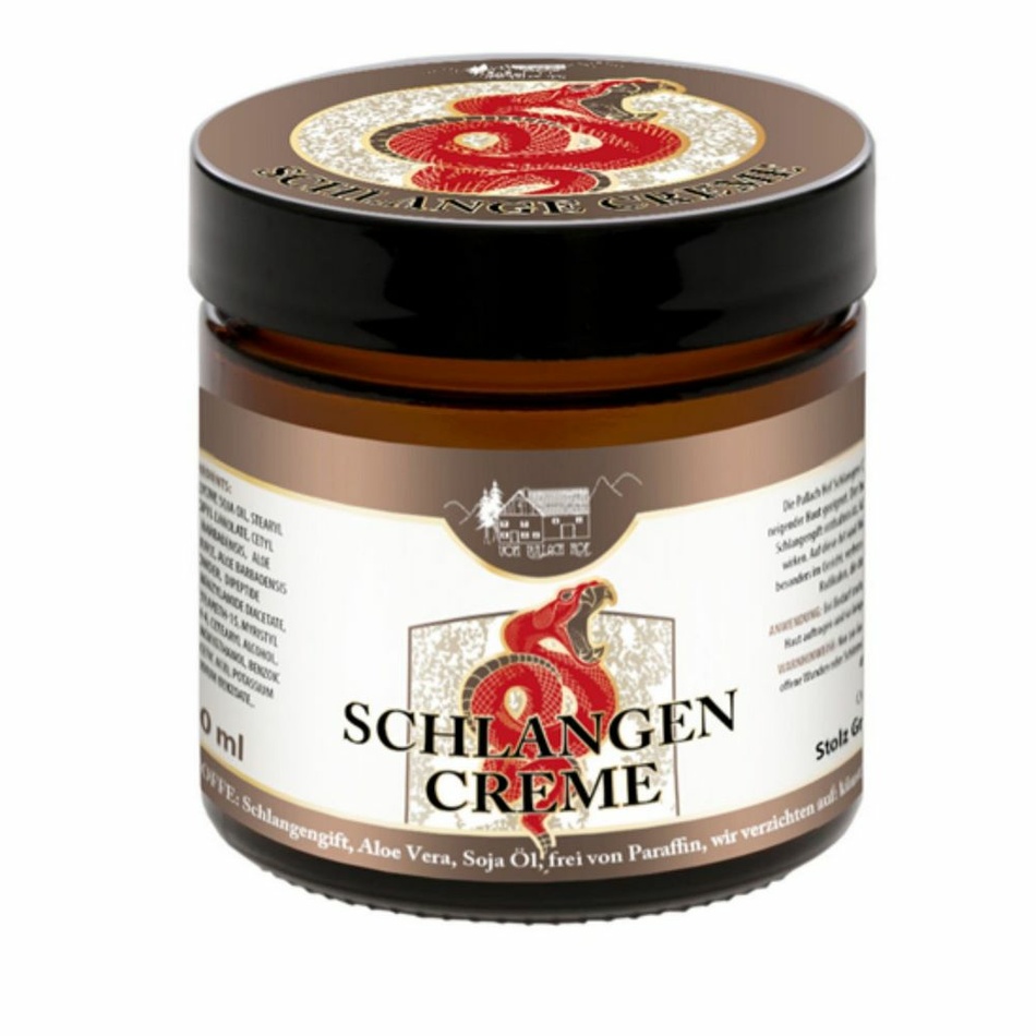 Krém proti vráskam na báze syntetického peptidu, ktorý napodobňuje účinky jedu zmije. Peptid pôsobí ako prírodný botox. Tento krém má vyhladzujúci účinok, redukuje tvorbu mimických vrások, bojuje proti predčasnému starnutiu, zabraňuje ochabovaniu pleti. Hadí jed navyše chráni pred voľnými radikálmi, ktoré môžu podporovať starnutie pokožky.Krém obsahuje ďalšie prírodné látky, ako aloe vera a sójový olej, ktoré pozitívne pôsobia na zdravý a mladistvý vzhľad pleti. Výťažky z aloe vera pleť hydratujú, upokojujú, regenerujú, dodávajú pružnosť a sviežosť. Sójový olej má zmäkčujúce a zvláčňujúce účinky, zabraňuje vysychaniu pokožky.Krém je vhodný pre všetky typy pleti, pre vyzretú pleť, pre mužov aj ženy.Použitie: Krém naneste ráno a večer na vyčistenú pleť a jemne vmasírujte.Zloženie: Aqua; Glycerín; Glycín Soja Oil; Stearyl Alcohol; Isopropyl Lanolate; Cetyl Alcohol; Aloe Barbadensis; Aloe Barbadensis Leaf Juice; Aloe Barbadensis Leaf Juice Powder; Dipeptide Diaminobutyroyl Benzylamide; Diacetate; Ceteareth-25; Ceteareth-15; Myristyl Alcohol; Myreth-4; Cetearyl Alcohol; Tocopherol; Phenoxyetanol; Benzoic Acid; Dehydroacetic Acid; Potassium Sorbate; Sodium Benzoate