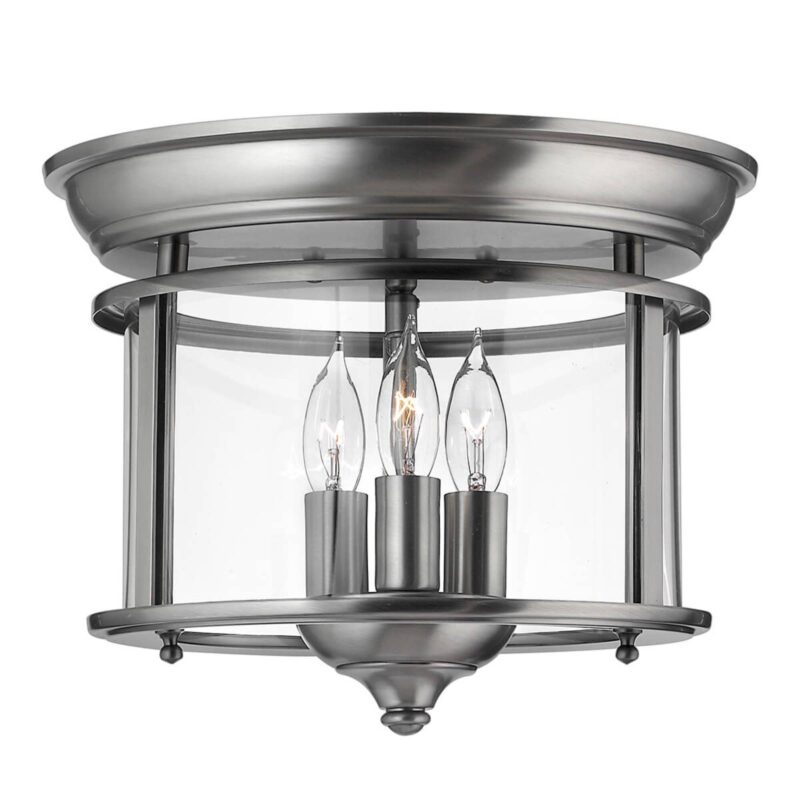 Tradične navrhnuté stropné svietidlo Gentry Stropné svetlo Gentry je nadčasovo nádherné a vďaka svojej cínovej úprave ho možno kombinovať aj s početnými farbami interiéru a štýlmi bývania. Tienidlo z číreho skla vám umožní vidieť tri integrované svetlá sviečok. Svetlo môže nerušene vyžarovať do všetkých smerov a poskytuje primerané okolité osvetlenie obývacích izieb alebo napr. B. sála. Gentry je obzvlášť atmosférický, keď sa ako zdroj svetla používajú žiarovky s nárazovým vetrom. Vhodné žiarovky je možné objednať pod príslušenstvom.