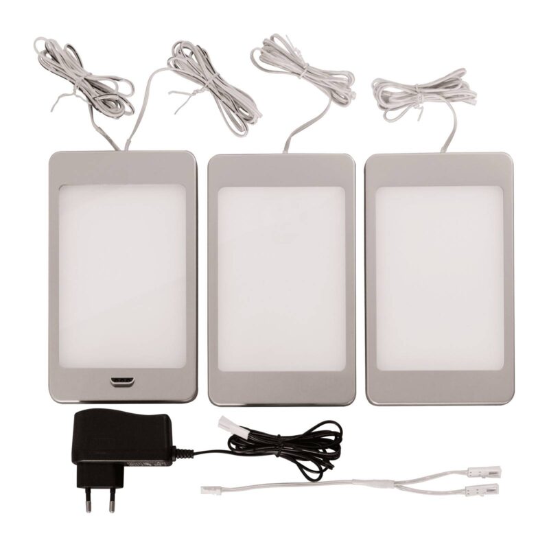 Sada LED podsvietenia Saskia s integrovaným senzorovým spínačom Na jednom z troch LED podsvietených svetiel skrinky je senzorový spínač. Je s ním možné bezkontaktné, plynulé stmievanie, ako aj zapínanie a vypínanie svetla. Vďaka tomu je LED svetlo Saskia moderným a praktickým spoločníkom do kuchyne a obývacej izby. Matný povrch vyžarujúci svetlo zabraňuje oslneniu a zaisťuje teplé biele, príjemné svetlo. Vďaka kompaktným rozmerom je možné panely ľahko integrovať do najrôznejších miestností a pôsobiť nenápadne a zároveň štýlovo. Osvetlenie pod skrinkou sa dodáva úplne pripravené na pripojenie, súčasťou je transformátor.