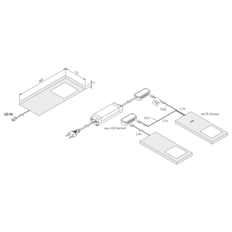 LED žiarovka do skrinky LED Slim-Pad F v súprave 3 umožňuje svietiť kuchyni a obývacej časti Obdĺžnikové svietidlo pod skrinku LED-Slim Pad F s čiernym, jednoduchým plastovým krytom sa prispôsobí takmer každému prostrediu. Je súčasťou tejto súpravy trikrát a umožňuje tak inštaláciu riadkov, napríklad za účelom efektívneho osvetlenia kuchynskej linky. Súčasťou dodávky je navyše aj bezkontaktný IR stmieva? jedného zo svetiel, ktorý má pamäťovú funkciu, pomocou ktorej sa obnoví individuálne nastavenie jasu aj po ďalšom zapnutí svetla. Svetlá sú každá vybavená 2,40 m dlhým pripojovacím káblom a na uvedenie do prevádzky je dodávaný aj transformátor (max. 30W), ku ktorému je možné pripojiť až šesť svetiel.