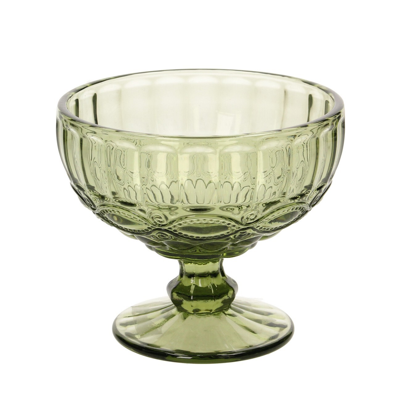 Pohár z hrubého reliéfneho skla v zelenej farbe. Trojrozmerný dizajn s originálnym vzorom, ktorý krásne odráža odlesky, čo zaručuje výrazný vzhľad podávaných dezertov.