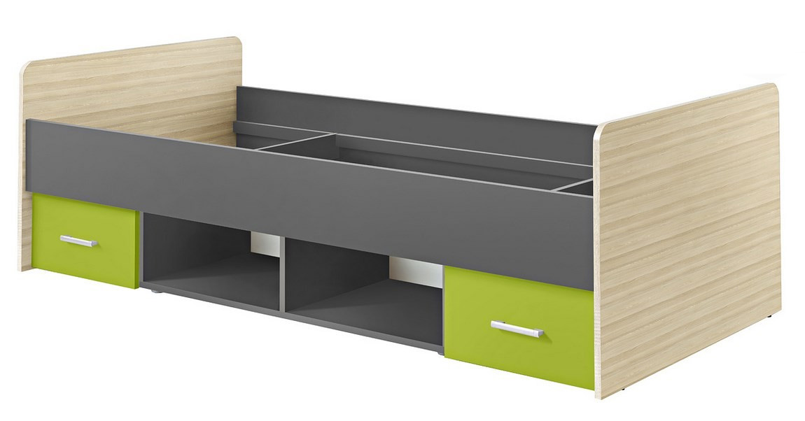 Jednolôžková posteľ PAULA s praktickými zásuvkami. Korpus nábytku je šedý, čielka postele majú farebný odtieň jaseň coimbra. Kontrastné prvky sú limetkovo zelené. Materiál LTD hrúbky 18mm. Rozmery v/š/h 62 x 204 x 96 cm. V cene postele nie je rošt ani matrac, odporúčame rozmery 90 x 200 cm.Posteľ odporúčame ku detskej izbe PAULA. V ponuke je tiež vo farbe jaseň coimbra/oranžová. Dodávame v demonte. Zásuvky sa pohybujú na kolieskach.