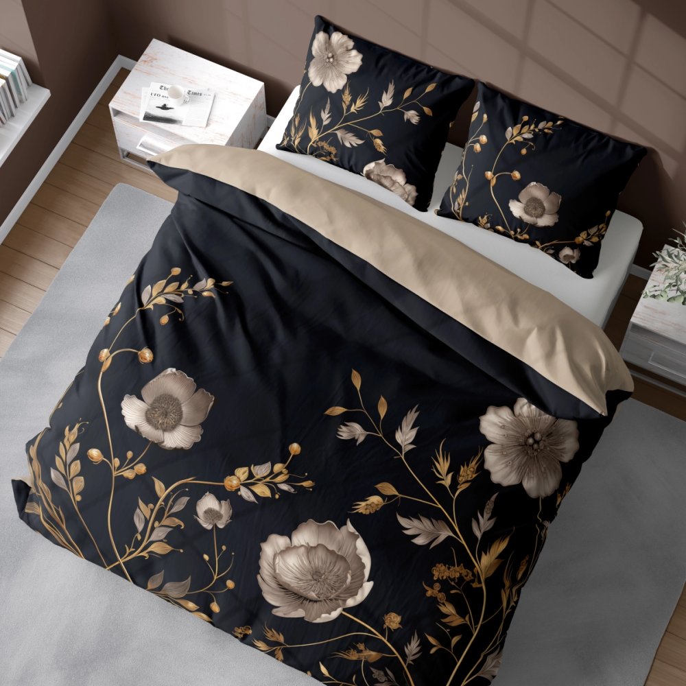 Posteľné obliečky z mikrovlákna – čierne s béžovo-zlatým kvetinovým vzorom 3 časti: 1ks 160×200 + 2ks 70×80