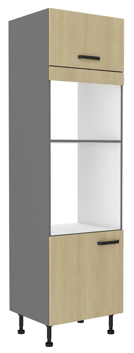 Štýlová kuchynská linka KOSTY zaujme najmä netradičným vzorom rybia kosť na dvierkach. Je vyrobená z kvalitnej 16 mm hrubej LTD dosky, čierne kovové úchyty vytvárajú príjemný kontrast s béžovými dvierkami. Korpus je vo farbe antracit.Skrinky disponujú ABS hranami a majú funkciu tichého dovierania, nožičky sú nastaviteľné.Vysoká potravinová skrinka 60 DPM-215-2F je dvojdverová a má rozmery (ŠxVxH): 60 x 215 x 57 cm.Vďaka bohatej ponuke kuchynských skriniek z kolekcie KOSTY si vyskladáte štýlovú kuchyňu podľa svojich vlastných predstáv a potrieb.Dodávame v demonte.