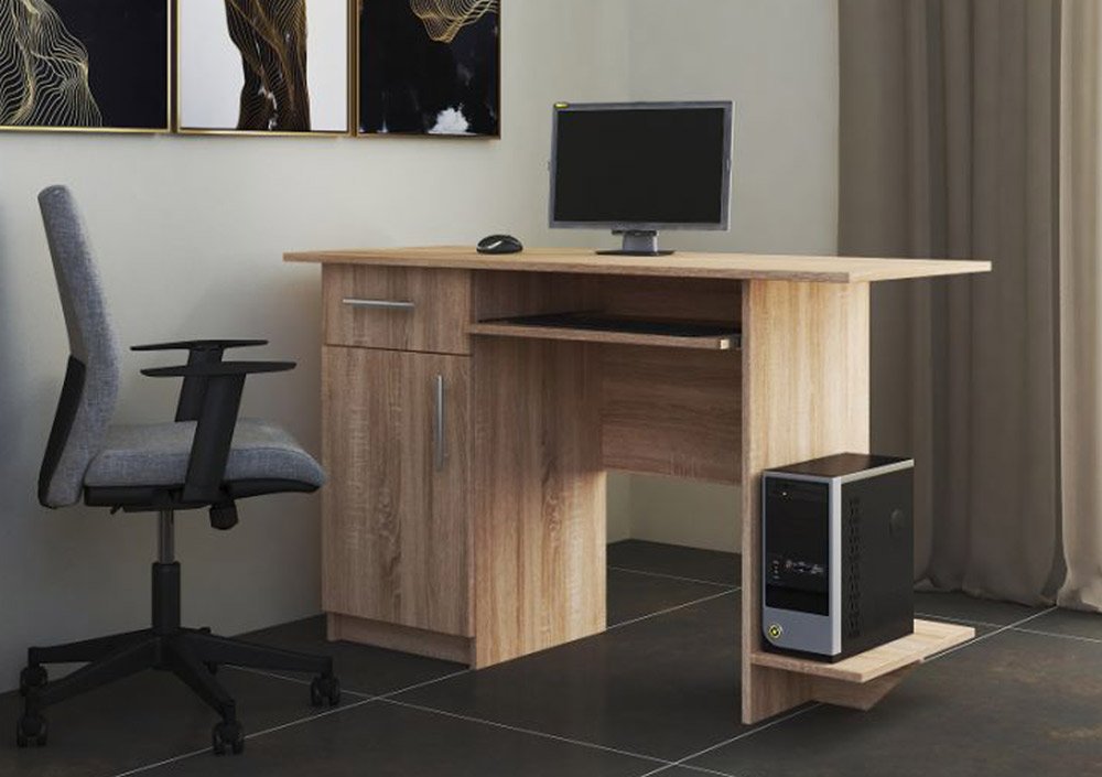 Pracovný stôl VEBER je moderný praktický písací stôl, ktorý je svojimi rozmermi vhodný doplnok aj do menších priestorov detskej izby, či do kancelárie. Vyrábaný je z kvalitnej LTD dosky. Farebné prevedenie: dub sonoma.Pod priestrannou pracovnou doskou sa nachádza praktická výsuvná doska, ktorá je ideálnym riešením pre usmiestnenie klávesnice a počítačovej myši. Na boku je umiestnená polica na odkladanie rôznych predmetov, prípadne na usmiestnenie počítača. Určite oceníte aj skrytý úložný priestor v podobe zásuvky a dvierok. Tento pracovný stôl je vhodným riešením pre všetkých, ktorí potrebujú svoj pracovný či študentský kutiť a zároveň majú malý priestor na jeho umiestnenie.Dodávame v demontovanom stave.