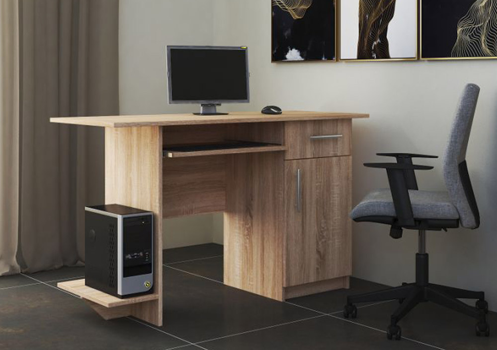 Pracovný stôl VEBER je moderný praktický písací stôl, ktorý je svojimi rozmermi vhodný doplnok aj do menších priestorov detskej izby, či do kancelárie. Vyrábaný je z kvalitnej LTD dosky. Farebné prevedenie: dub sonoma.Pod priestrannou pracovnou doskou sa nachádza praktická výsuvná doska, ktorá je ideálnym riešením pre usmiestnenie klávesnice a počítačovej myši. Na boku je umiestnená polica na odkladanie rôznych predmetov, prípadne na usmiestnenie počítača. Určite oceníte aj skrytý úložný priestor v podobe zásuvky a dvierok. Tento pracovný stôl je vhodným riešením pre všetkých, ktorí potrebujú svoj pracovný či študentský kutiť a zároveň majú malý priestor na jeho umiestnenie.Dodávame v demontovanom stave.