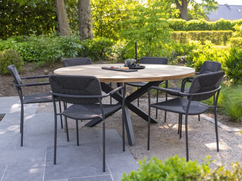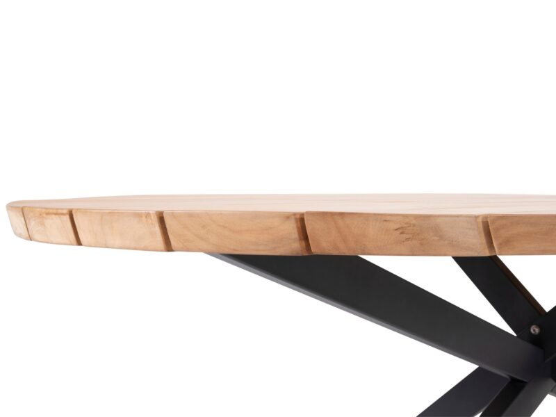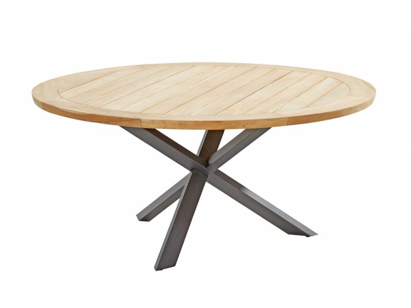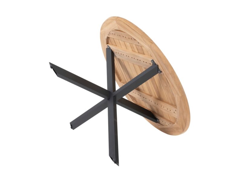 Luxusný jedálenský stôl Prado v neobvyklom prevedení z teakového dreva a antracitovými nohami z nerezovej ocele.