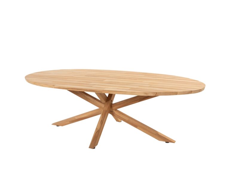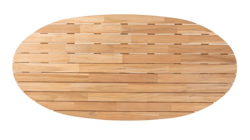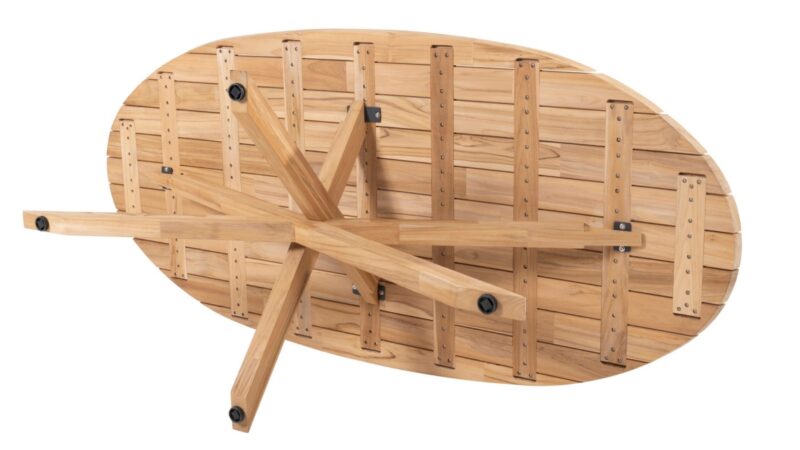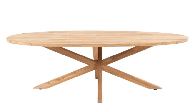 Neprehliadnuteľný jedálenský stôl Prado z teakového dreva v prírodnom sfarbení a zaujímavo riešeným podstavcom.