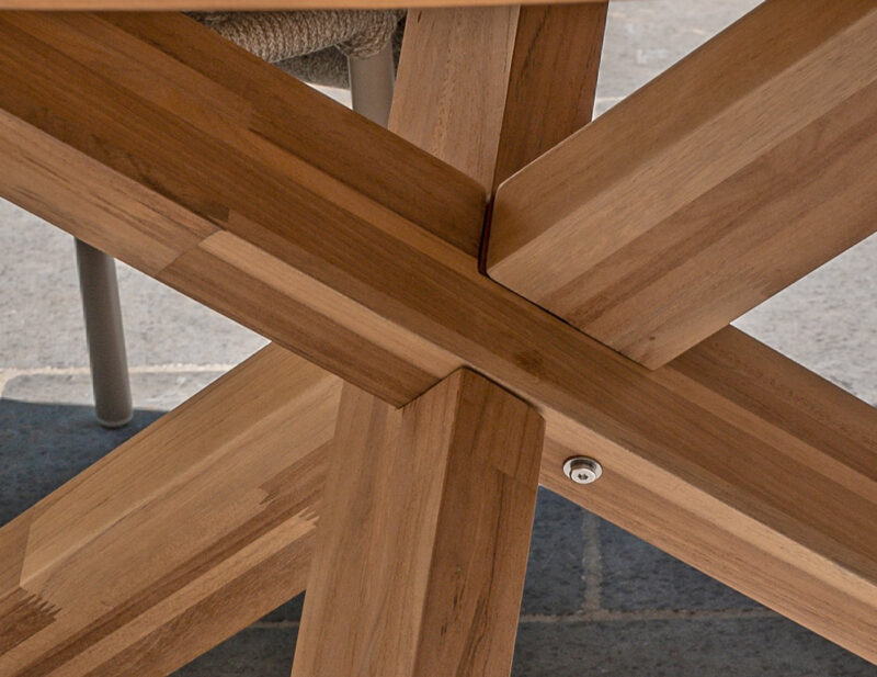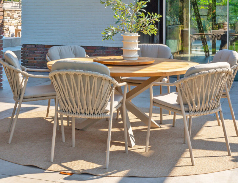 Stolová súprava Prado Manitoba (1+6) kombinuje eleganciu a funkčnosť. Teakový stôl s okrúhlou doskou dopĺňa 6 stohovateľných stoličiek Manitoba s hliníkovým rámom, rope výpletom a pohodlnými sedákmi pre maximálny komfort.
