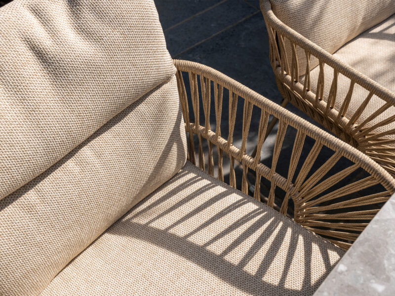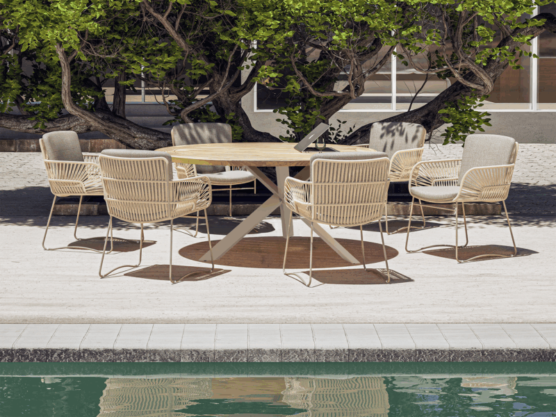 Jedálenská súprava Prado Murcia (1+6) je spojením elegancie, odolnosti a pohodlia. Teakový stôl s krížovou oceľovou podnožou dopĺňa šesť stoličiek Murcia v štýlovom rope výplete s mäkkými vankúšmi vo farbe latte. Perfektná voľba pre rodinné obedy či večerné posedenia na terase.