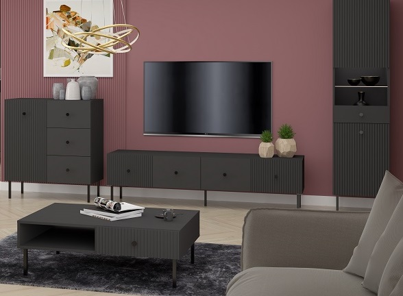 Ak hľadáte originálny nábytok do svojho interiéru, nábytok PRADY je perfektnou voľbou. Nábytok má estetický dekor frézovaných dverí, minimalistické úchytky a vysoké nožičky, čím úchváti nejedného zákazníka, ktorý má rád eleganciu a štýlovosť.Obývacia zostava je vyrobená z kvalitných LTD dosiek, ktoré sú nenáročné na údržbu. Nožičky sú kovové.Farba: antracit.Obývacia stena sa skladá z týchto prvkov:Televízny stolík – rozmery (š,v,h): 180 x 48 x 42 cm,vitrína – rozmery (š,v,h): 47 x 193 x 42 cm,komoda 1D3S – rozmery (š,v,h): 91 x 98 x 42 cm.V našej ponuke nájdete aj ďalšie prvky PRADY.Dodávame v demontovanom stave.