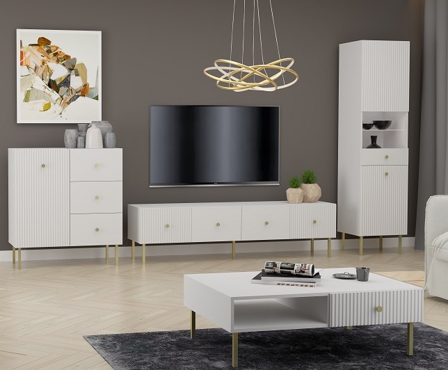 Ak hľadáte originálny nábytok do svojho interiéru, nábytok PRADY je perfektnou voľbou. Nábytok má estetický dekor frézovaných dverí, minimalistické úchytky a vysoké nožičky, čím úchváti nejedného zákazníka, ktorý má rád eleganciu a štýlovosť.Obývacia zostava je vyrobená z kvalitných LTD dosiek, ktoré sú nenáročné na údržbu. Nožičky sú kovové.Farba: biela, zlatý úchyt.Obývacia stena sa skladá z týchto prvkov:Televízny stolík – rozmery (š,v,h):  180 x 48 x 42 cm,vitrína – rozmery (š,v,h):  47 x 193 x 42 cm,komoda 1D3S –  rozmery (š,v,h): 91 x 98 x 42 cm.V našej ponuke nájdete aj ďalšie prvky PRADY.Dodávame v demontovanom stave.