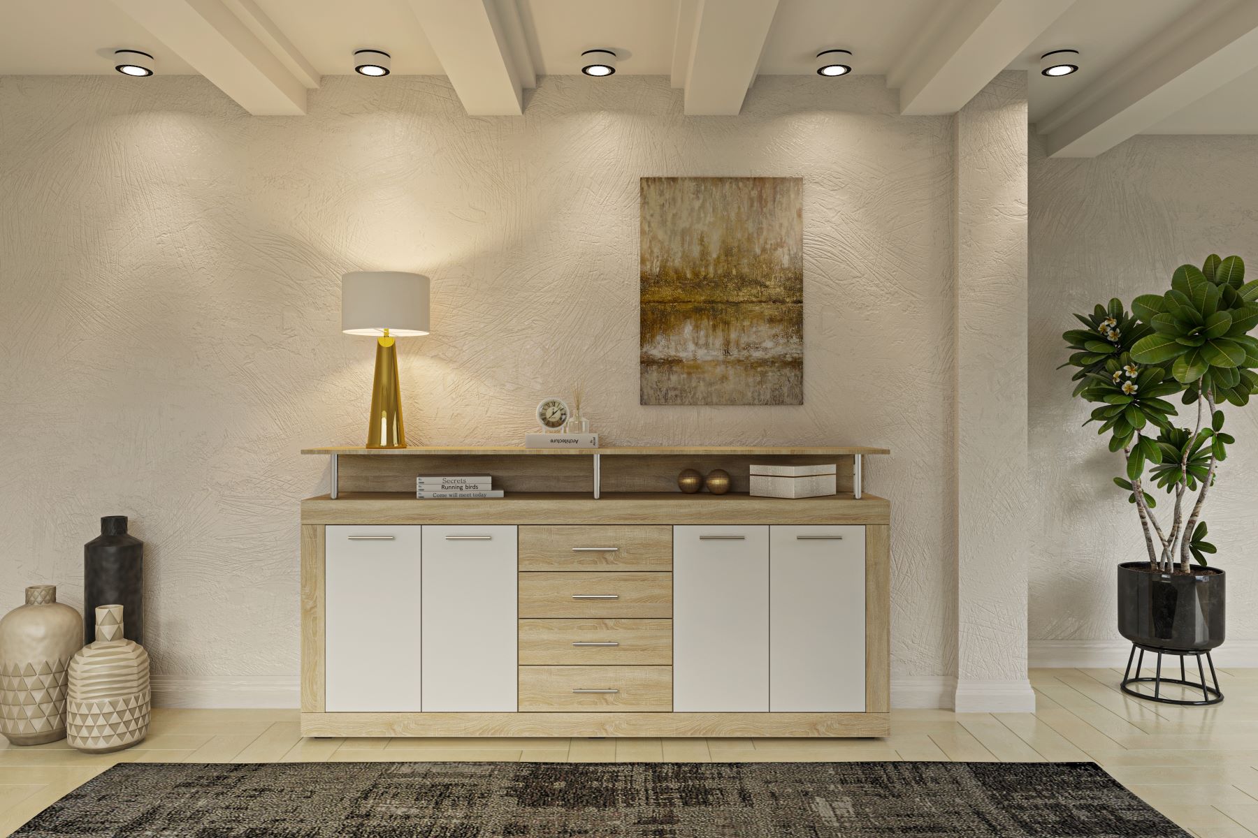 S komodou PRAHA získate nielen dizajnový kúsok, ale najmä praktický kus nábytku s bohatým úložným priestorom. Komoda je štvordverová, má štyri zásuvky a v hornej časti je nadstavba na uloženie dekorácii. Elegantný vzhľad dopĺňajú kovové úchyty. Farebné prevedenie dub sonoma-bielaJe vyrobená z kvalitnej LTD dosky nenáročnej na udržiavanie.Rozmery (ŠxVxH): 195 x 97 x 37 cm.Dodávame v demonte.