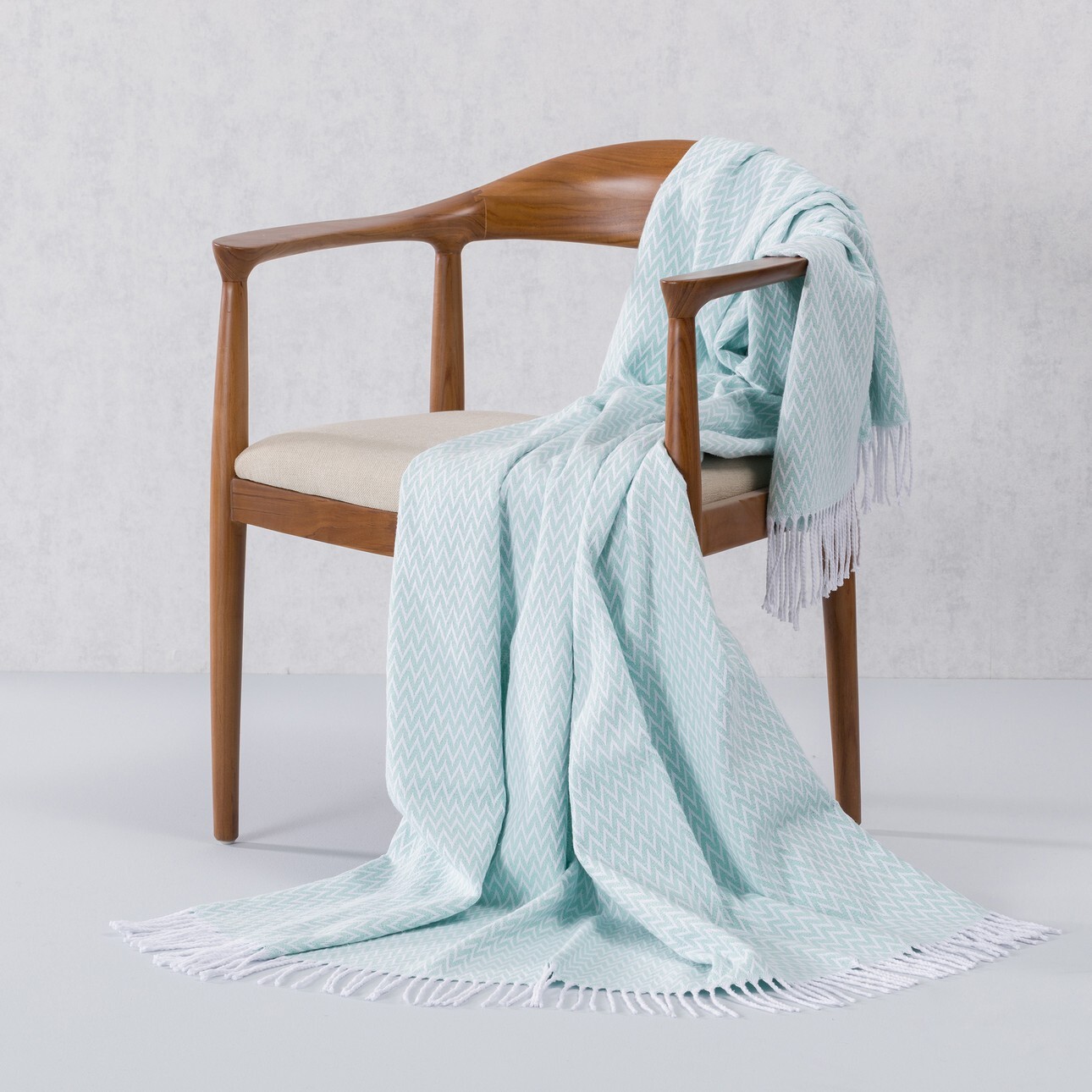 Zmesová tkanina veľmi príjemná na dotyk, mäkká s geometrickými vzormi v pravidelných štvorcoch so strapcami po oboch stranách. Vhodná ako prehoz cez posteľ, alebo na sedačku.