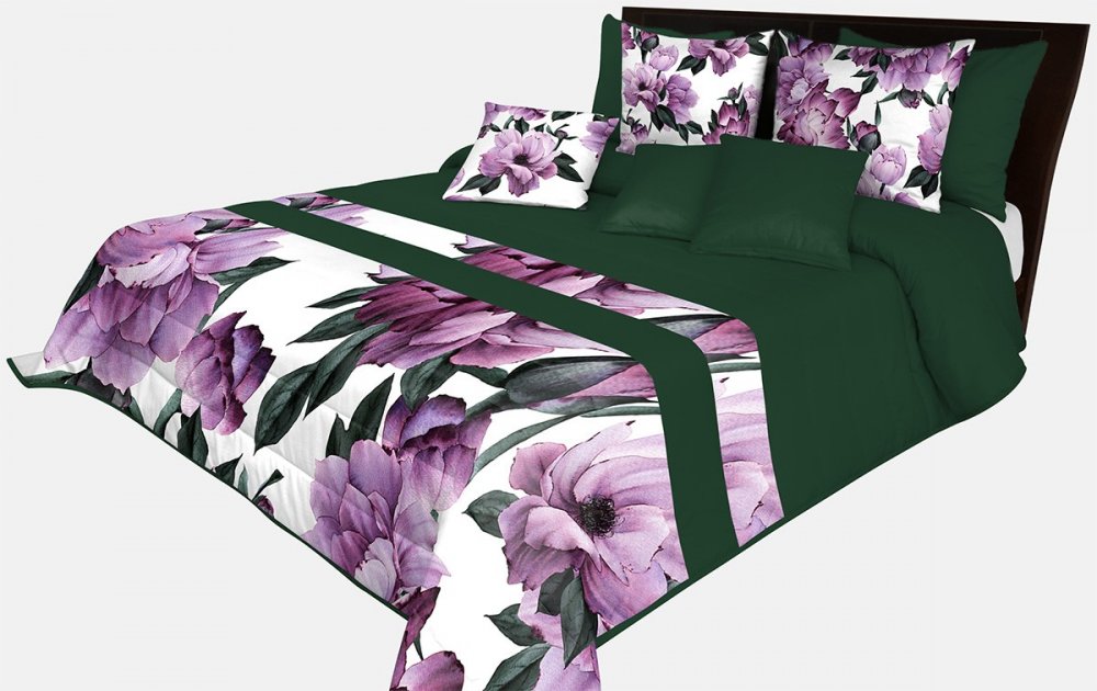 Prehoz na posteľ v krásnej zelenej farbe s potlačou dokonalých fialových kvetov Šírka: 240 cm | Dĺžka: 260 cm Šírka: 240 cm | Dĺžka: 260 cm