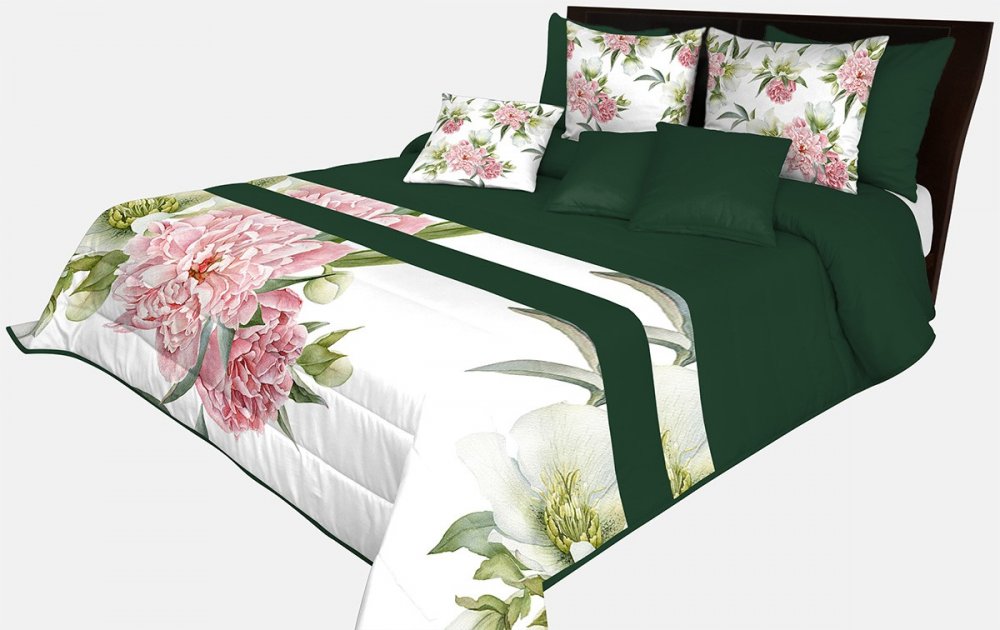 Prehoz na posteľ v smaragdovo zelenej farbe s potlačou veľkej ružovej kvetiny Šírka: 240 cm | Dĺžka: 260 cm Šírka: 240 cm | Dĺžka: 260 cm