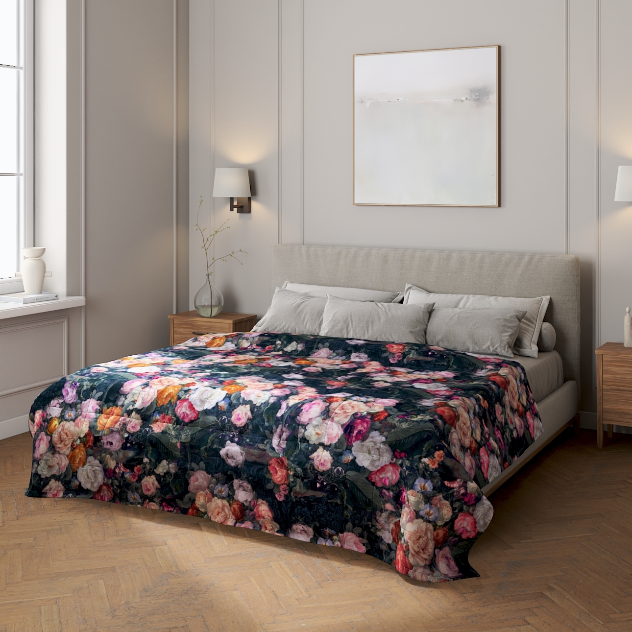 Prehoz prešívaný do štvorcov, farebné kvety na tmavom pozadí, Gardenia, 161-02