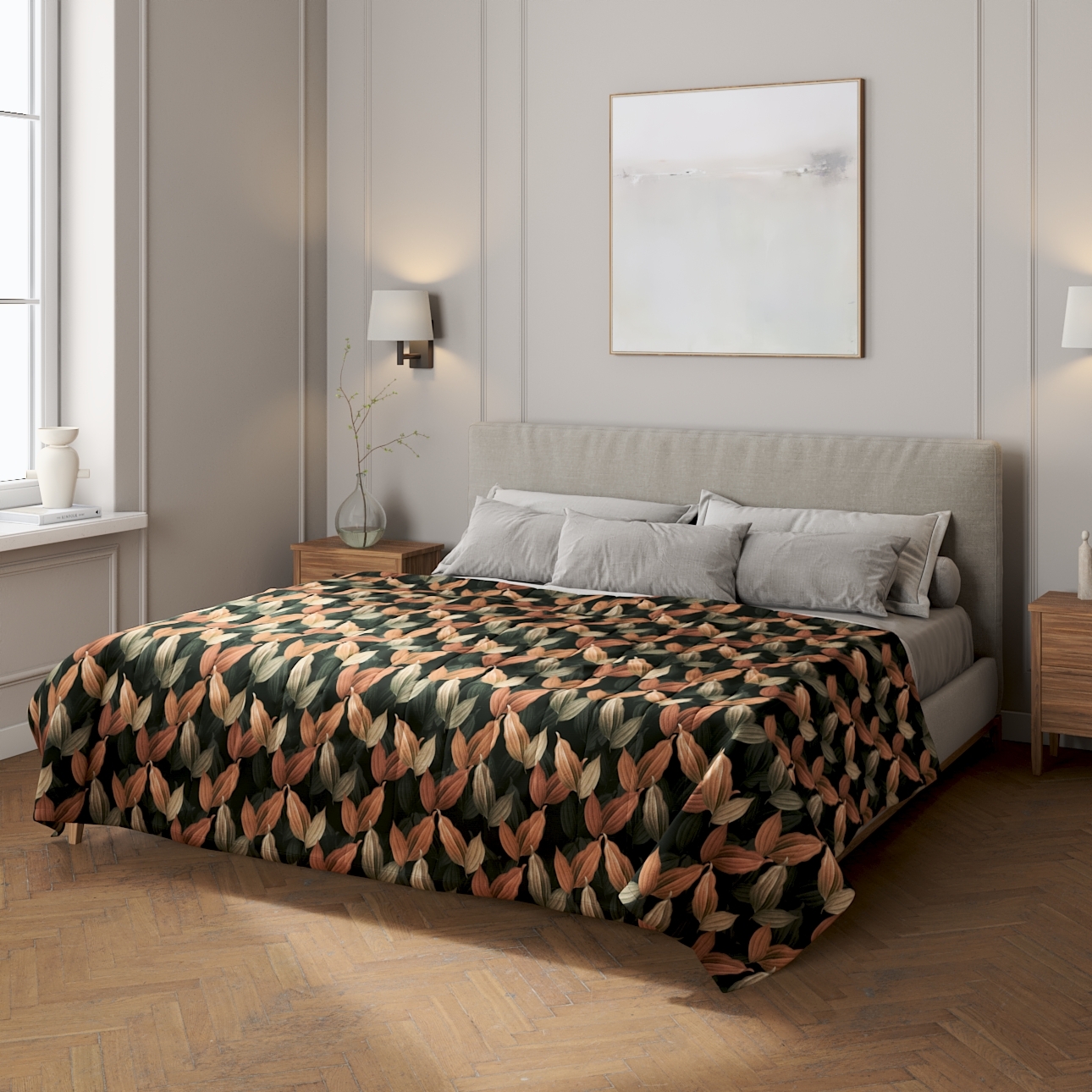 Prehoz s pozdĺžným prešívaním, borskyňovo – hnedé listy na čiernom pozadí, Abigail, 143-21
