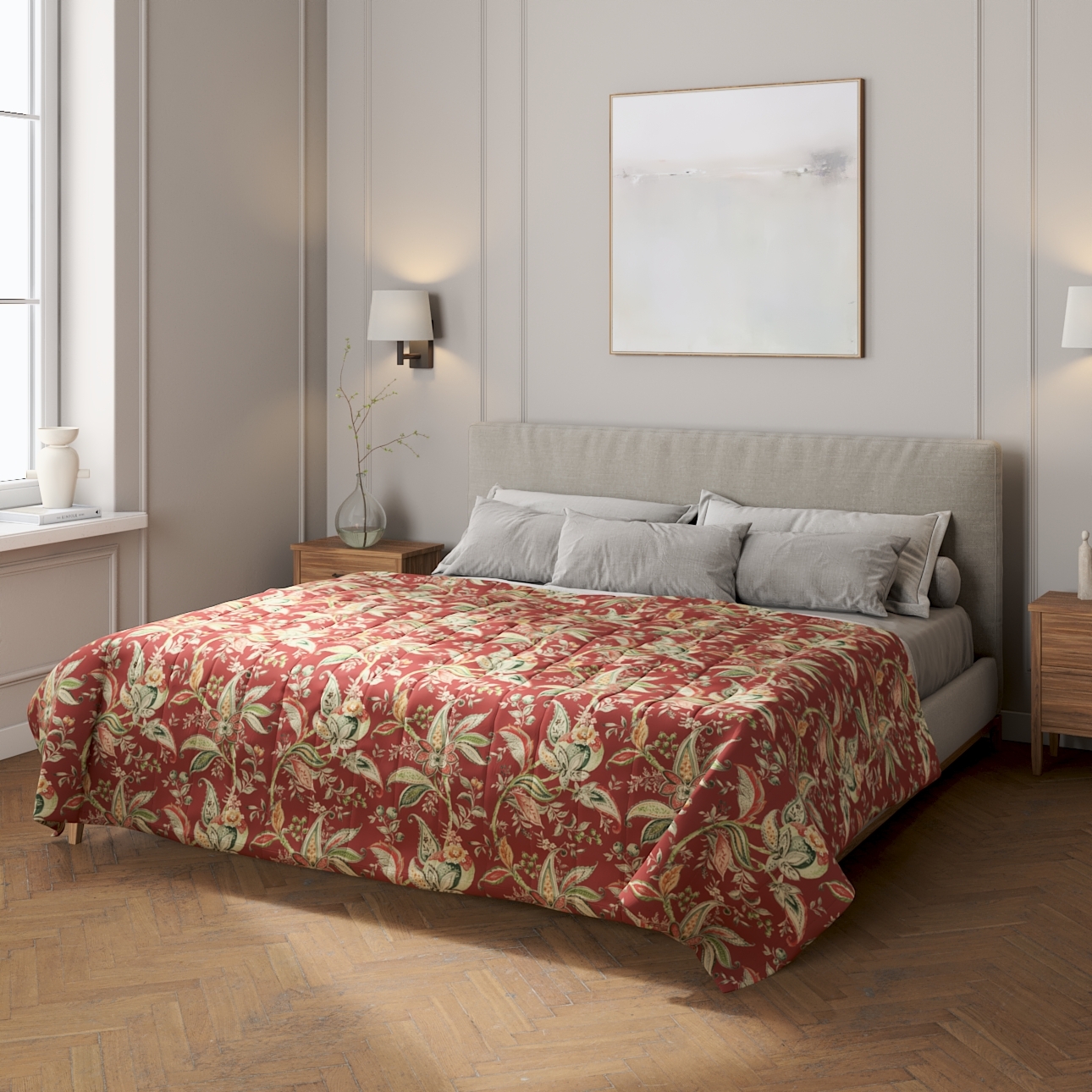 Pridajte prvú recenziu pre “Prehoz s pozdĺžným prešívaním, kvetinové vzory na pozadí z tehlovo-červenom podklade, Gardenia, 142-12”