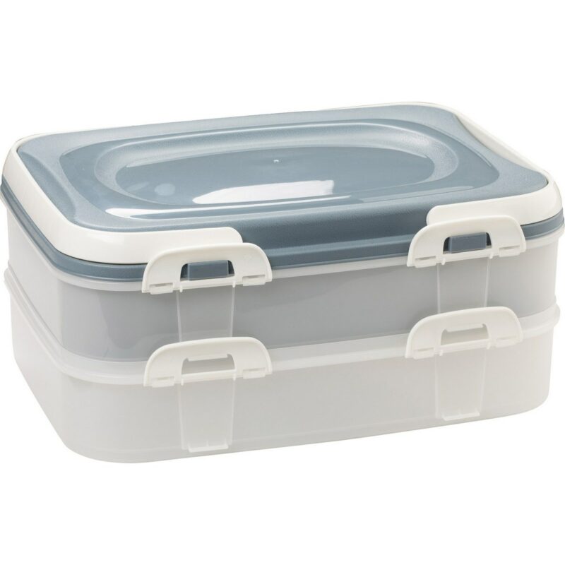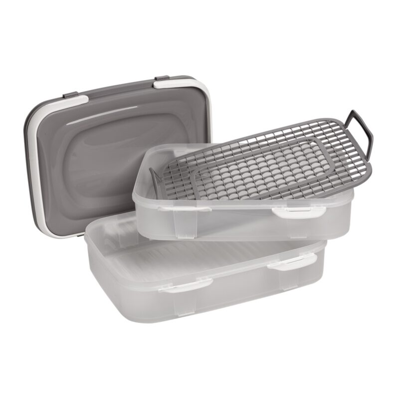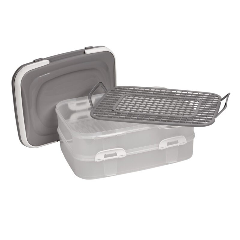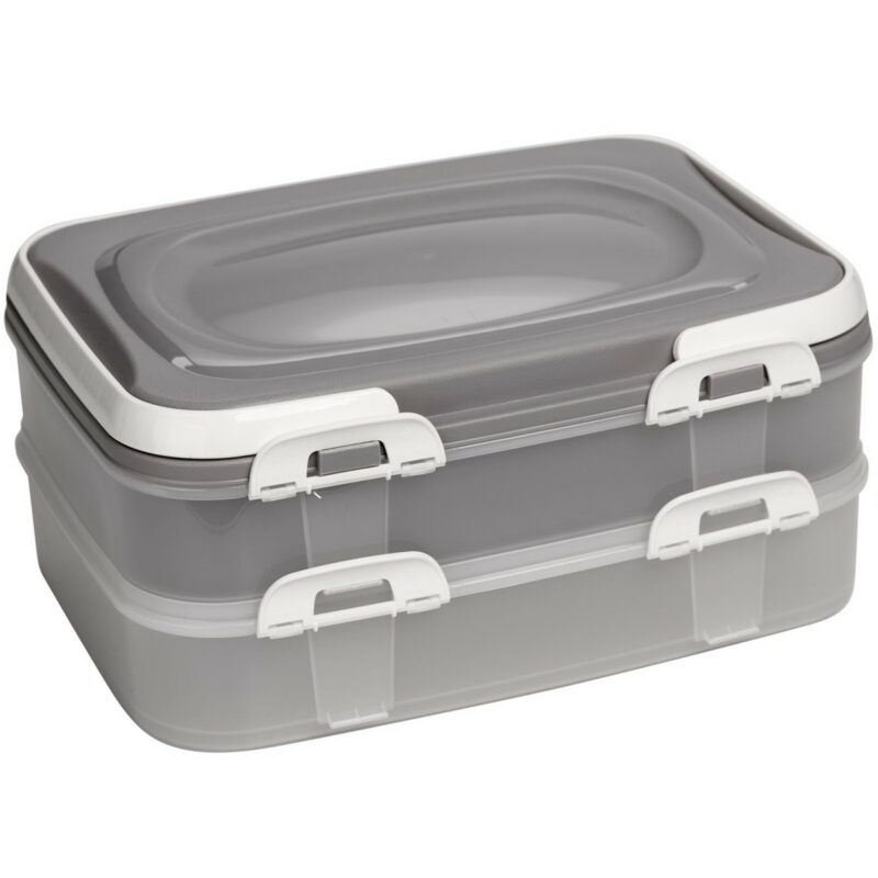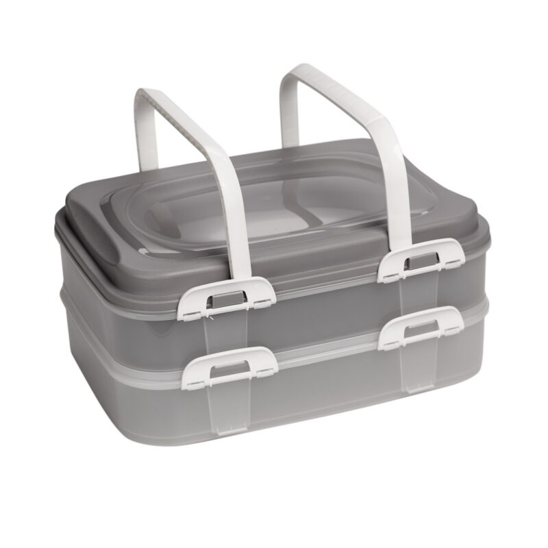 Dvojposchodový plastový box využijete nielen na prepravu potravín, ale aj pre prenášanie chlebíčkov, jednohubiek či sladkostí pri prípravách na oslavu alebo návštevu. Veko je opatrené dvoma držadlami pre pohodlné nosenie, boxy sú spojené pevnými klipsami. Súčasťou je mriežka s ušami pre ľahké vyberanie vložených potravín. Dodávame v troch farebných prevedeniach bez možnosti výberu.