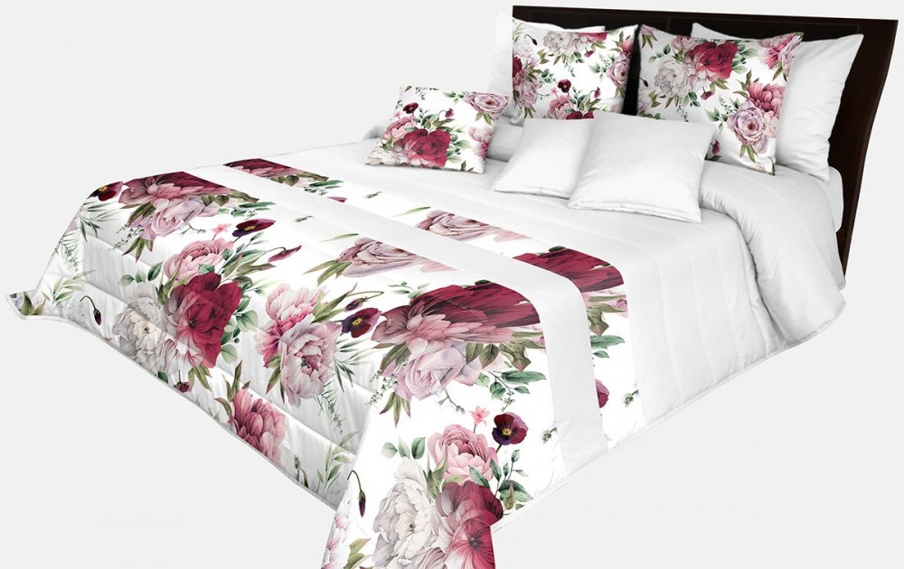 Prešívaný prehoz na posteľ v bielej farbe s dokonalou potlačou ružových a bordových pivonií Šírka: 200 cm | Dĺžka: 220 cm Šírka: 200 cm | Dĺžka: 220 cm
