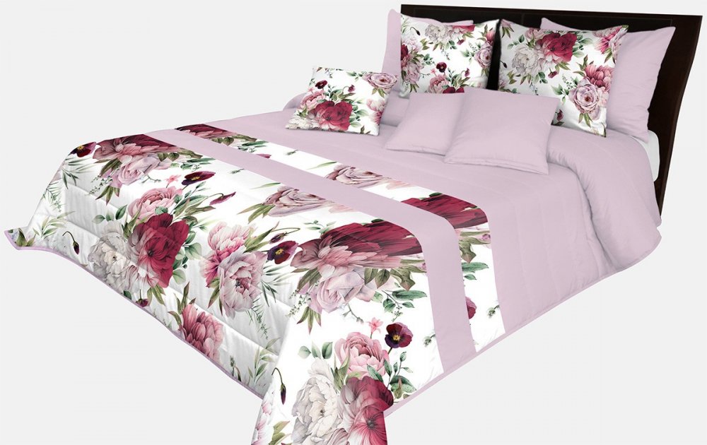 Prešívaný prehoz na posteľ v svetlo fialovej farbe s dokonalou potlačou ružových pivonií Šírka: 240 cm | Dĺžka: 240 cm Šírka: 240 cm | Dĺžka: 240 cm