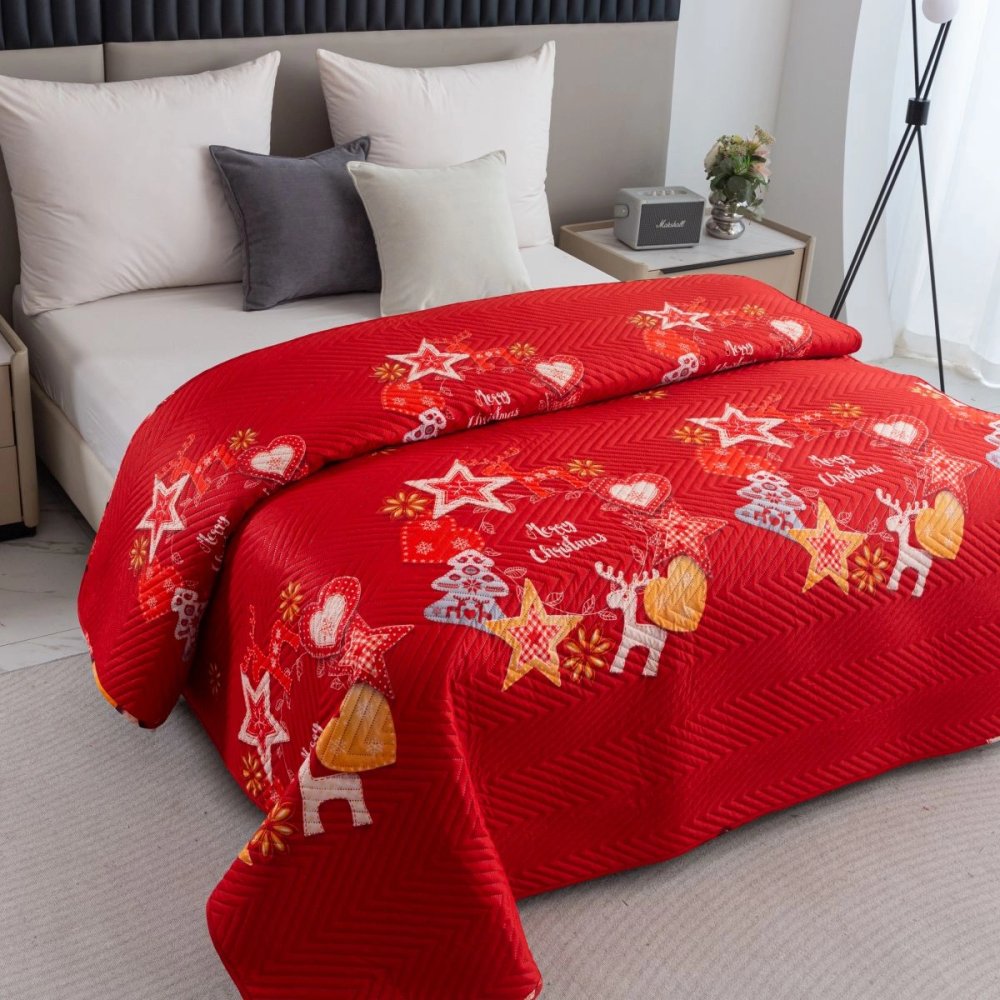Prešívaný vianočný prehoz na posteľ červený s motívom hviezd a sobov Šírka: 170 cm | Dĺžka: 210 cm