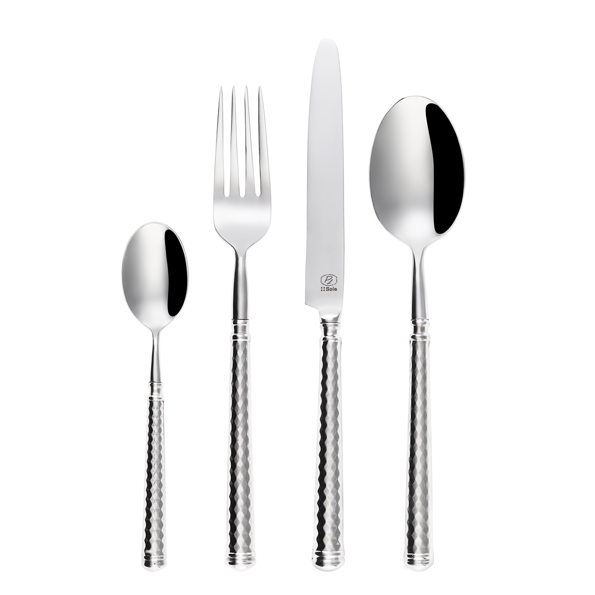 Luxusný, ručná práca. Príborová súprava Cubism 21st Century patrí do luxusnej rady Platinum Line. Každý kus je vyrobený ručne, s dutými rúčkami. Zdobenie v tvare jemných diamantov na rúčkach a moderný dizajn je špeciálne navrhnutý pre náročných klientov s moderným i rustikálnym vybavením interiérov. Set obsahuje: -6× lyžica -6× nôž -6× vidlička -6× lyžička na kávu