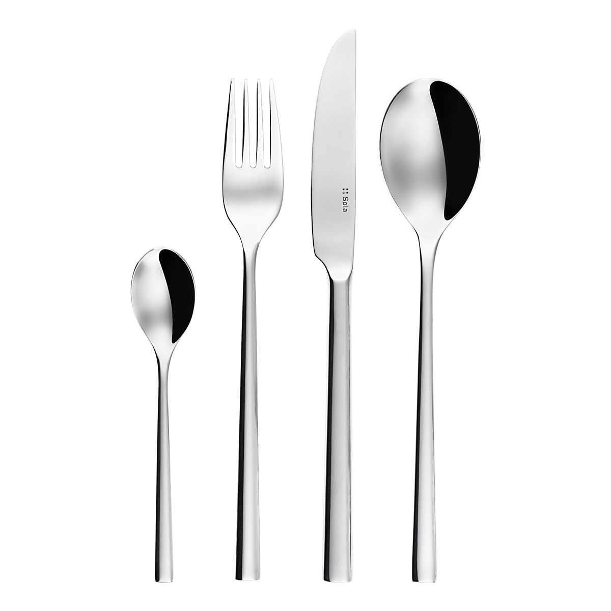lesklý Príborová línia Living z rady Premium. Kovaný príbor s nadčasovým jednoduchým dizajnom. Hranaté ukončenie a jednoduché čisté línie sa hodia do každého typu interiéru. Aj vďaka týmto vlastnostiam je najpredávanejšou líniou značky Sola. Set obsahuje: 6× lyžica 6× nôž 6× vidlička 6× lyžička na kávu