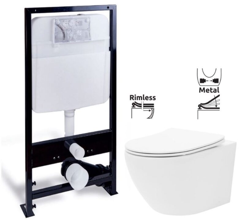 PRIM predstenový inštalačný systém bez tlačidla + WC REA Carlo Flat Mini Rimlesss + SEDADLO PRIM_20/0026 X CF1