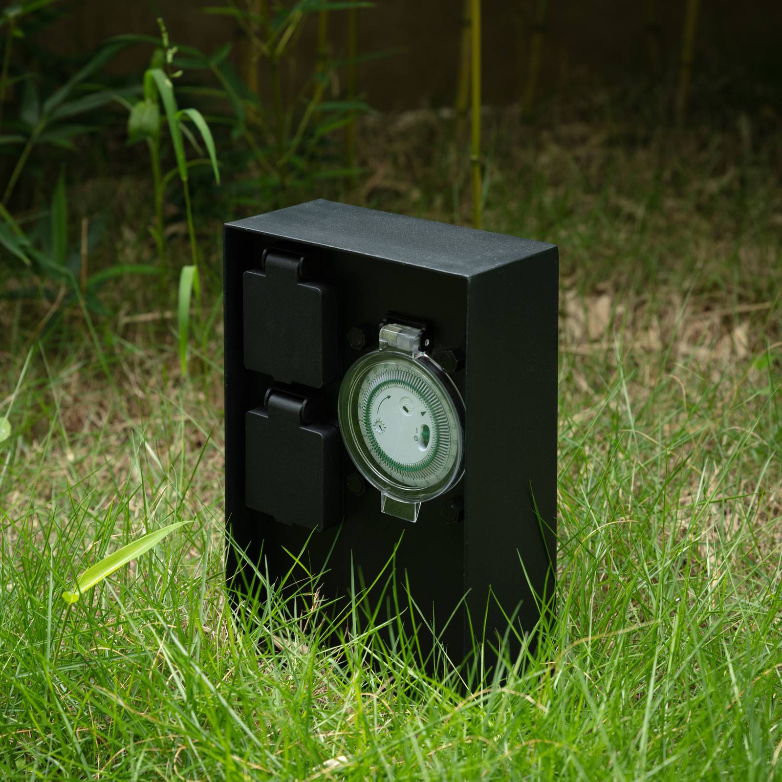 Čierny zásuvkový stĺp Foranda s časovačom a 2 zásuvkami, na vonkajšie použitie, nerezová oceľ Foranda je vhodná na vonkajšie použitie s krytím IP44 a dve zásuvky sú dobre chránené klapkami, keď sa nepoužívajú. Integrovaný časovač sa dá zapnúť podľa potreby, aby zásuvky fungovali v určitom čase. To je obzvlášť užitočné, keď ide o dekoratívne osvetlenie dvora a záhrady, ktoré by sa malo rozsvietiť až po zotmení. Stačí použiť časovač a svetelné zdroje sa každý večer v určitom čase automaticky zapnú a neskôr opäť vypnú. Vianočné osvetlenie je tu obľúbeným príkladom použitia, ktoré bez veľkej námahy rozjasní tmavé ročné obdobie dekoratívnymi svetelnými bodmi. Stĺpik s dvoma zdrojmi energie sa dá samozrejme použiť aj na iné účely – 2 x CEE 7/3 (max. 16 A/max. 3600 W)