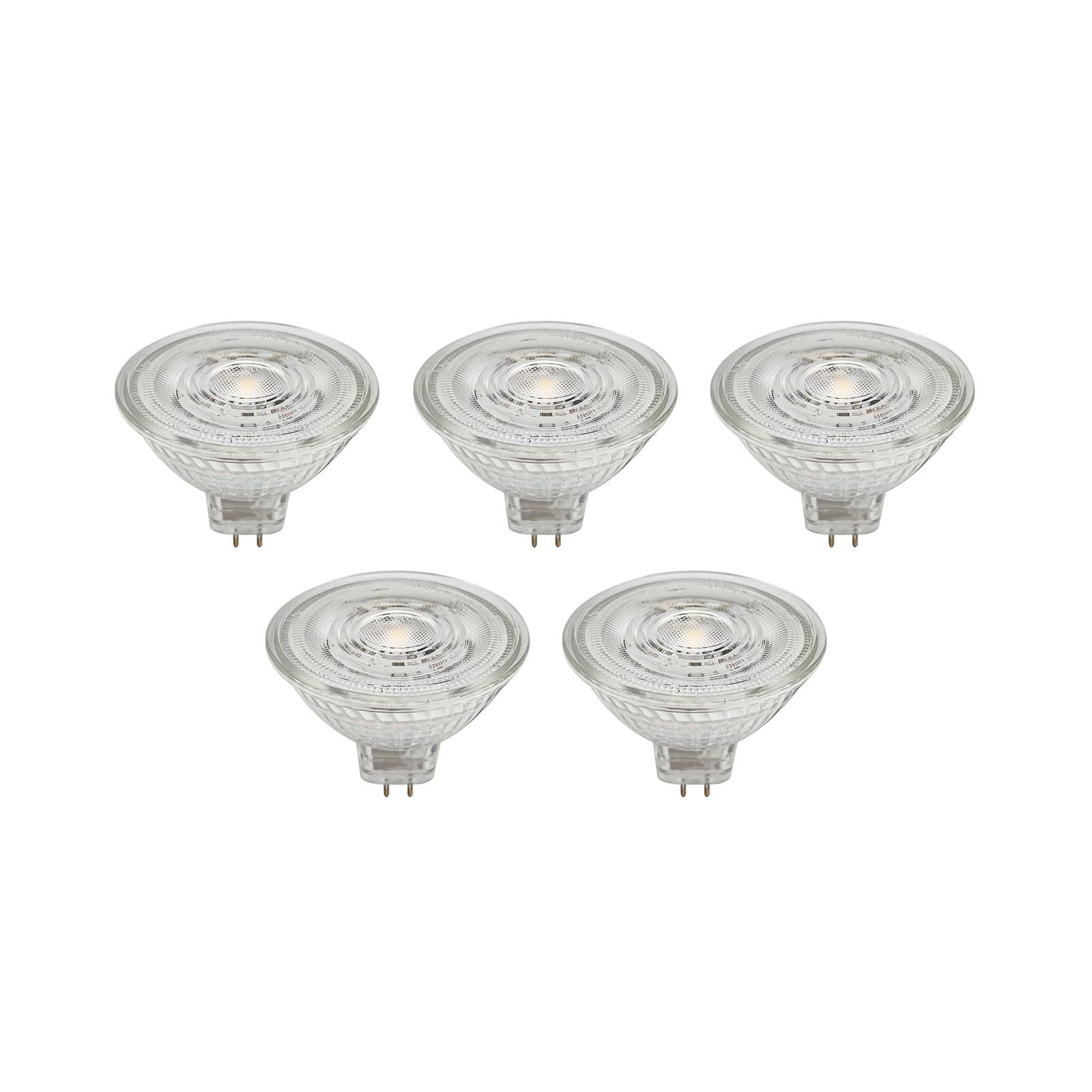 LED reflektor GU5.3 zo skla, priehľadný, v praktickej sade 5 ks Tento LED reflektor je vhodný pre mnohé svietidlá s päticou GU5.3. Je vyrobený zo skla a vďaka priehľadnému farebnému prevedeniu sa dá flexibilne používať – nestmievateľný – 4,3 W – 345 lúmenov – uhol vyžarovania 36° – dodávaný v sade 5 kusov