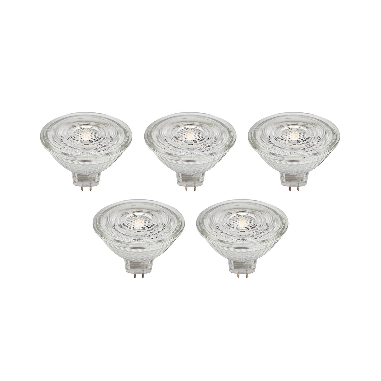 GU5.3 4,9W LED reflektor zo skla, priehľadný, v praktickej sade 5 ks Tento LED reflektor je vhodný pre mnohé svietidlá s päticou GU5.3. Je vyrobený zo skla a vďaka transparentnému farebnému vyhotoveniu sa dá flexibilne používať – nestmievateľný – 4,9 W – 500 lúmenov – uhol vyžarovania 36° – dodávaný v sade 5 kusov