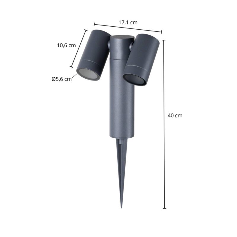 Pozemný bodový reflektor Tulimar s dvoma pohyblivými bodmi Pozemný bodový reflektor Tulimar je mimoriadne praktický na vonkajšie použitie. Vďaka dvom bodom, ktoré sa dajú pohybovať nezávisle od seba, dokáže optimálne osvetliť vstupný priestor alebo záhradnú cestu. Vďaka stupňu krytia IP65 možno tento reflektor dlhodobo spoľahlivo používať vo vonkajšom prostredí. Tmavosivá povrchová úprava dobre zapadá do rôzneho okolia bez toho, aby hneď vynikla.
