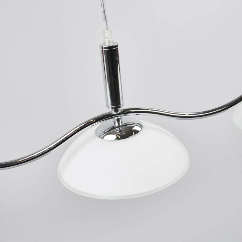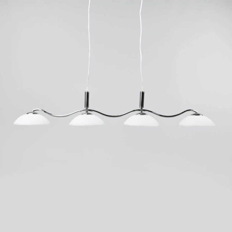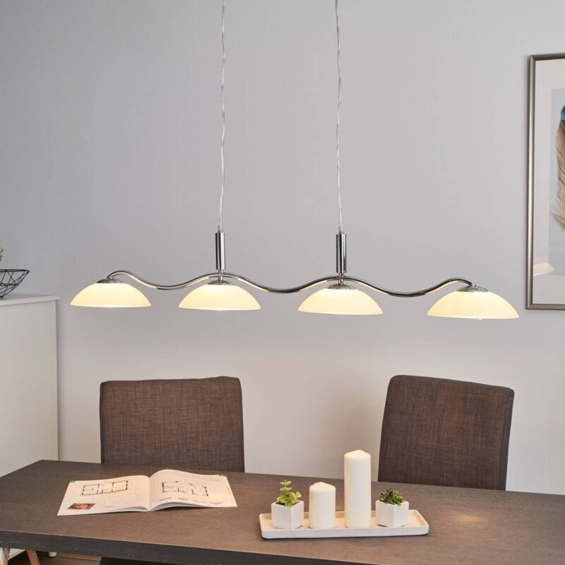 Závesné svietidlo Priscilla s rámom v tvare vlny a štyrmi okrúhlymi sklenenými tienidlami Závesné svietidlo Priscilla inšpiruje elegantným vlnovým dizajnom a jednoduchými odtieňmi bieleho skla. Môže byť zavesený maximálne do výšky 1,15 m napríklad nad jedálenský stôl, kde poskytuje jemné svetlo. Nadčasová klasika pre širokú škálu štýlov vybavenia.
