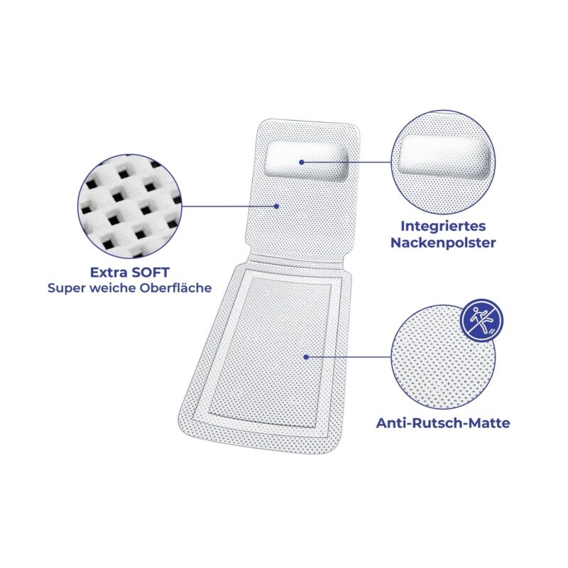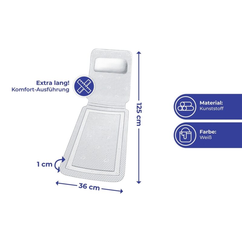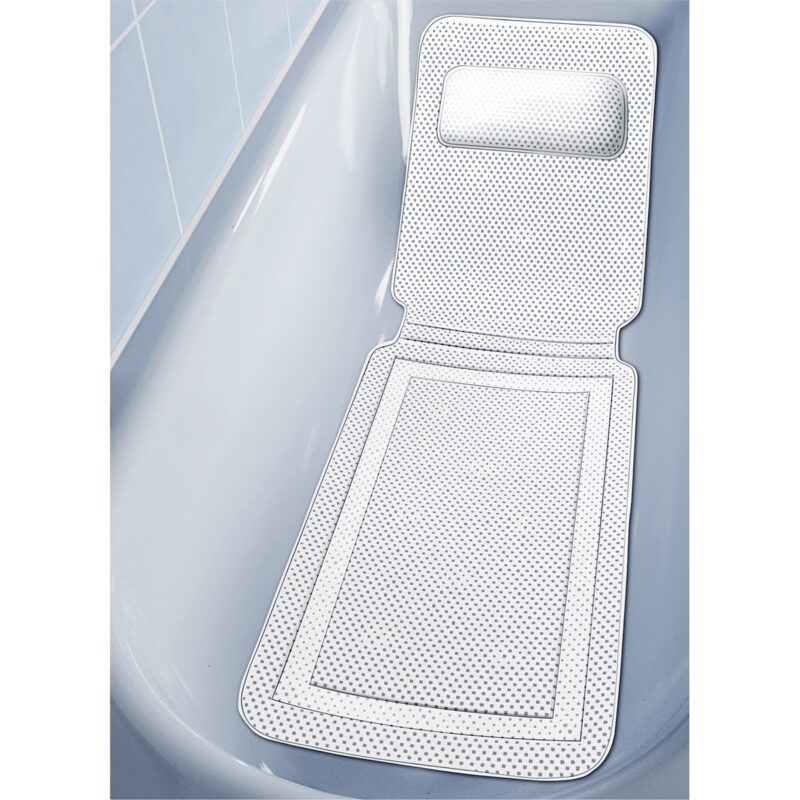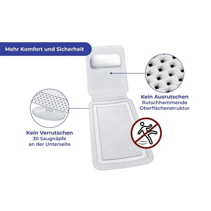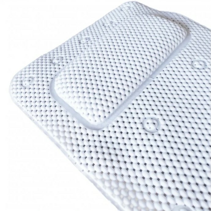 Komfortná protišmyková podložka z mäkkého plastu zaistí bezpečnosť a pohodlie pri kúpaní. Integrovaný vankúšik v oblasti krku spríjemní relaxáciu. Podložka má na spodnej strane prísavky, ktoré perfektne priľnú k vani. Háčik na zadnej strane umožní podložku po kúpeli zavesiť pre rýchlejšie usušenie.