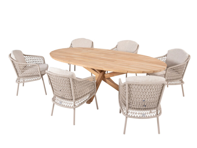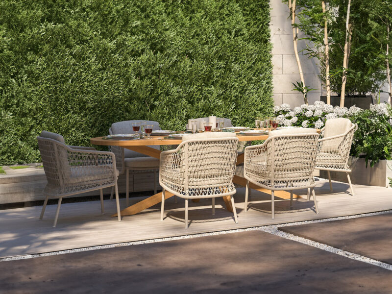 Elegantná stolová súprava Puccini v jemných odtieňoch na záhradnú terasu.
